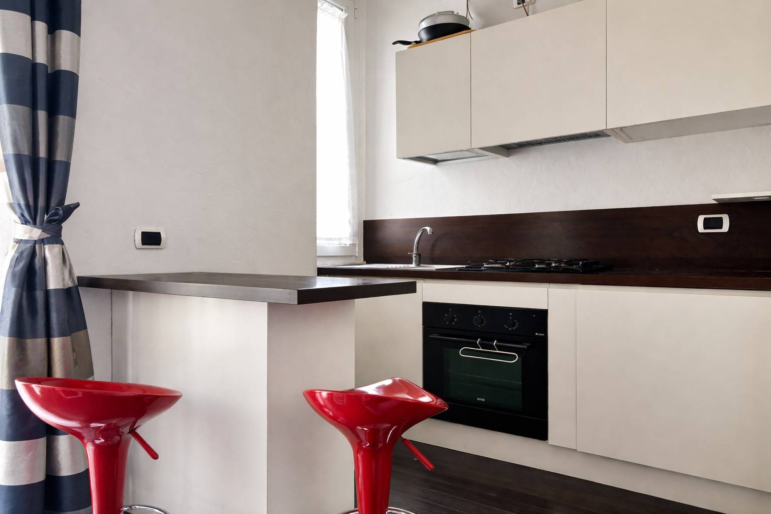 Il soggiorno con cucina a vista e pratica penisola offre uno spazio funzionale e ben distribuito; da qui si accede a un grazioso balconcino con affaccio interno, perfetto per garantire silenzio e privacy.