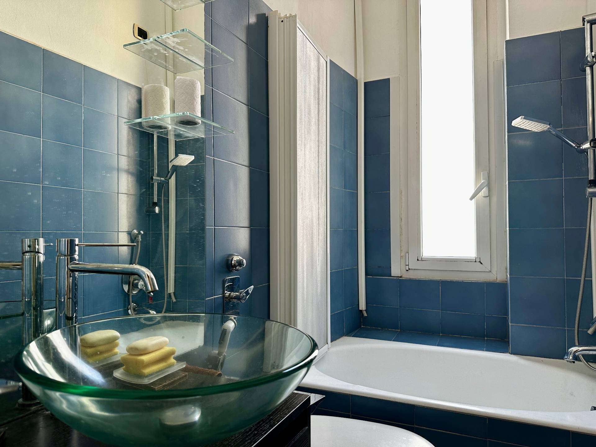Il bagno dotato di vasca con vetro doccia, permettendo sia lutilizzo come vasca tradizionale sia come comoda doccia.