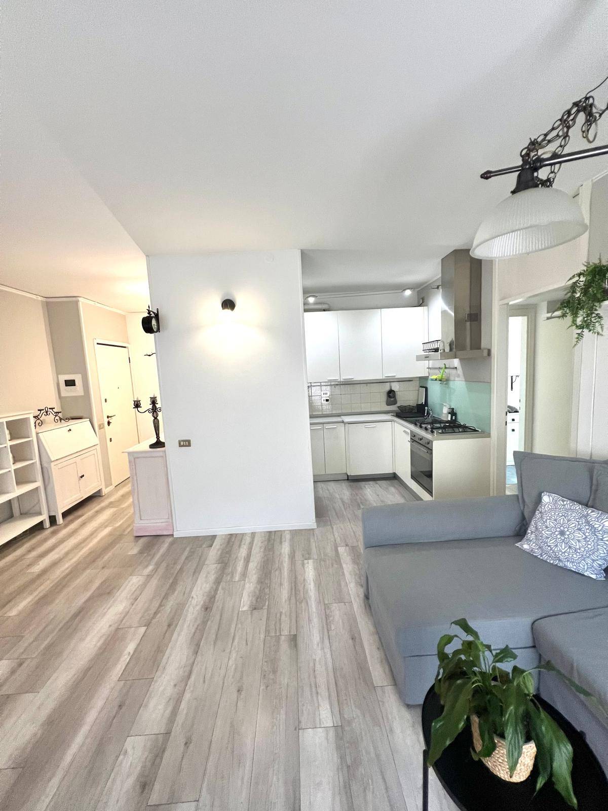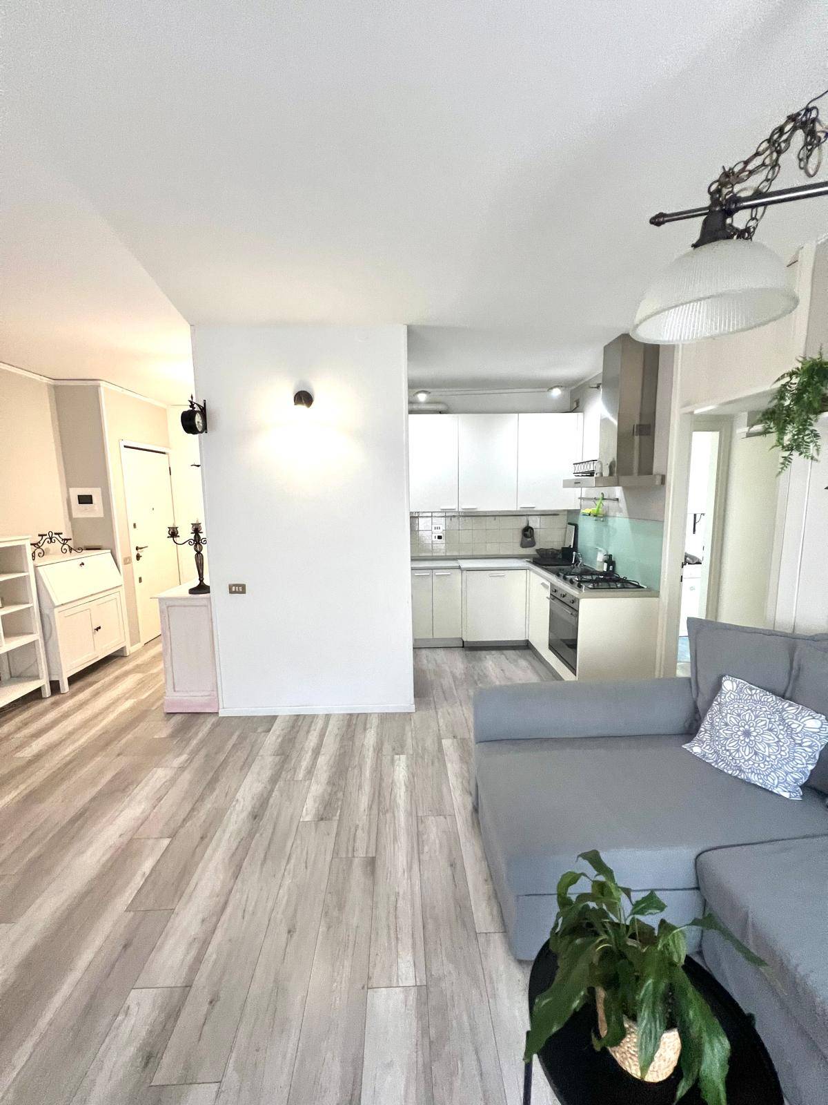 Ingresso su zona giorno funzionale con zona relax e angolo cottura, disimpegno notte, camera letto e bagno.