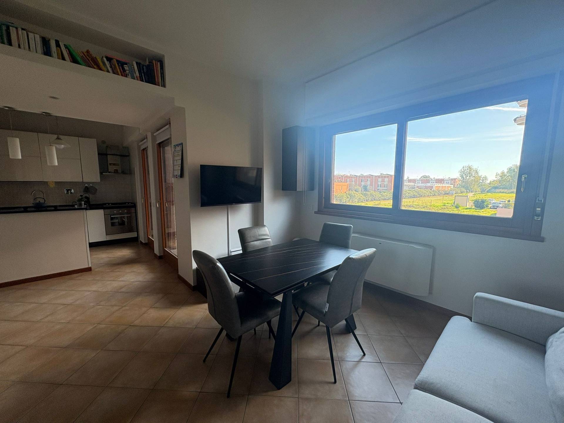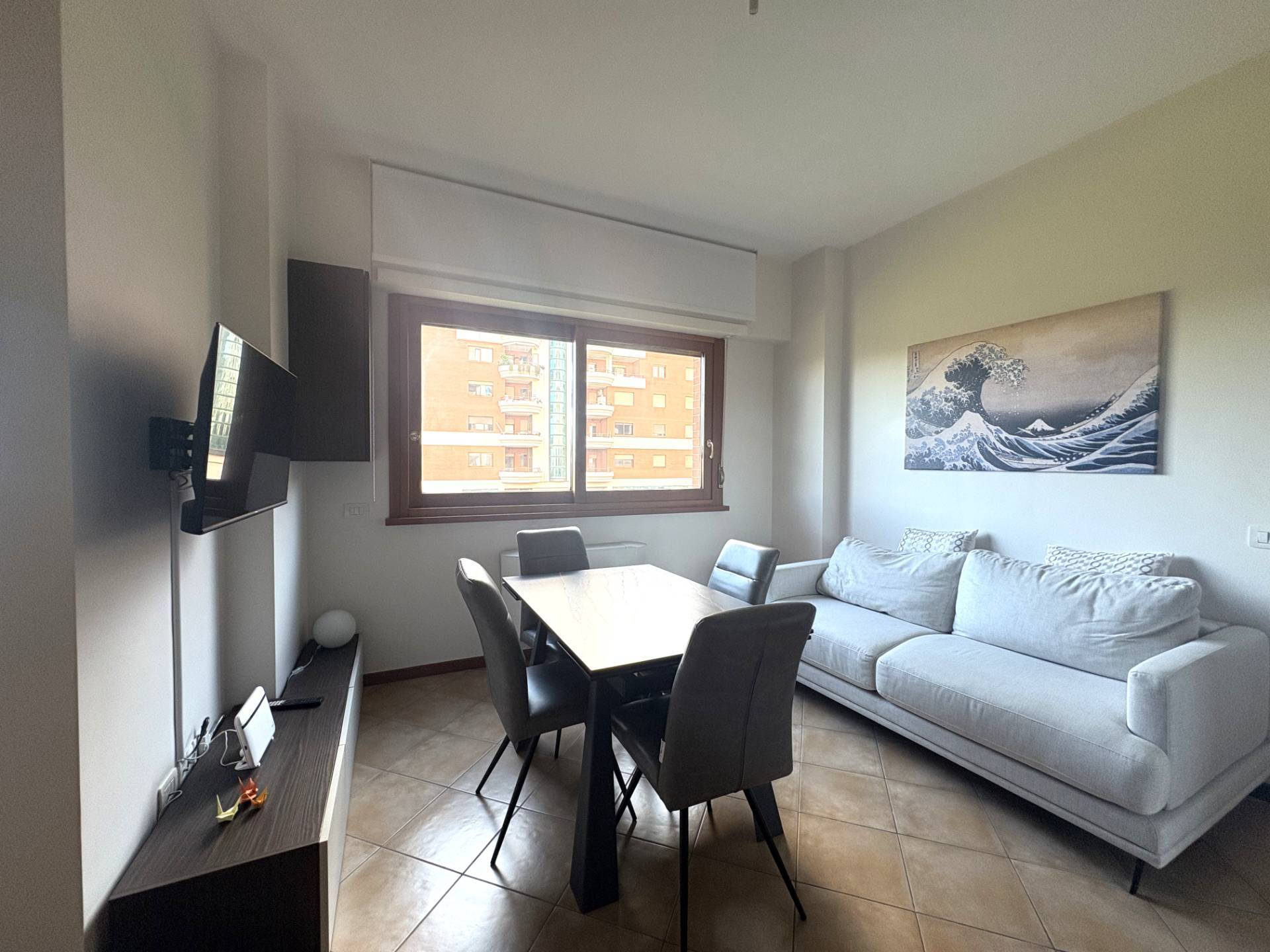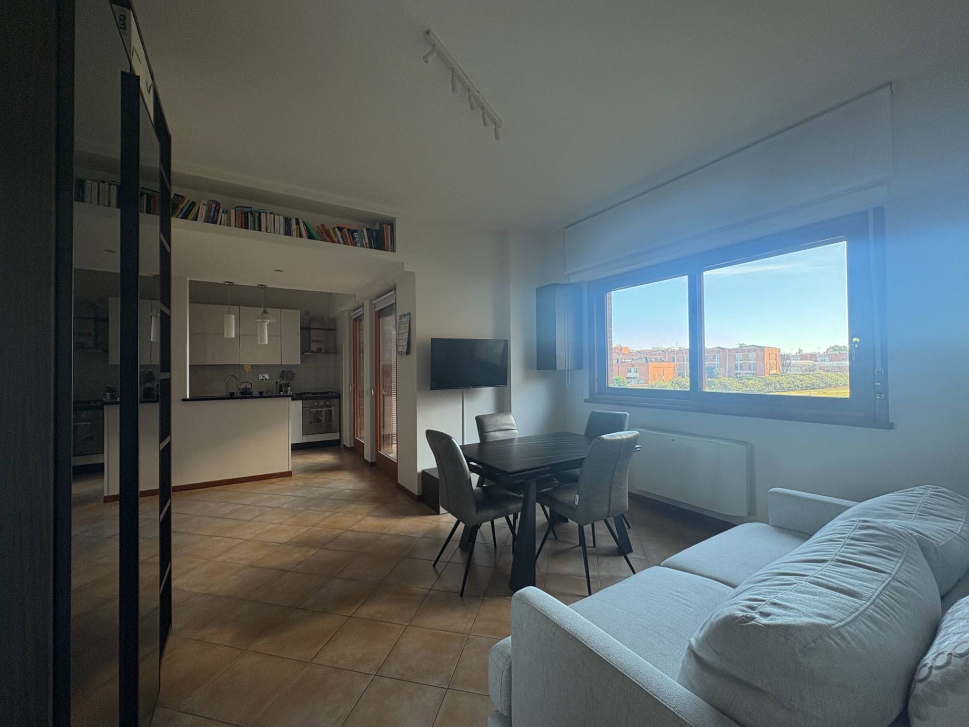 L'appartamento si compone di un accogliente soggiorno con cucina a vista completamente arredata con zona penisola per pranzare, una camera matrimoniale, un bagno con doccia e un o terrazzo circolare che garantisce una piacevole esposizione esterna.
