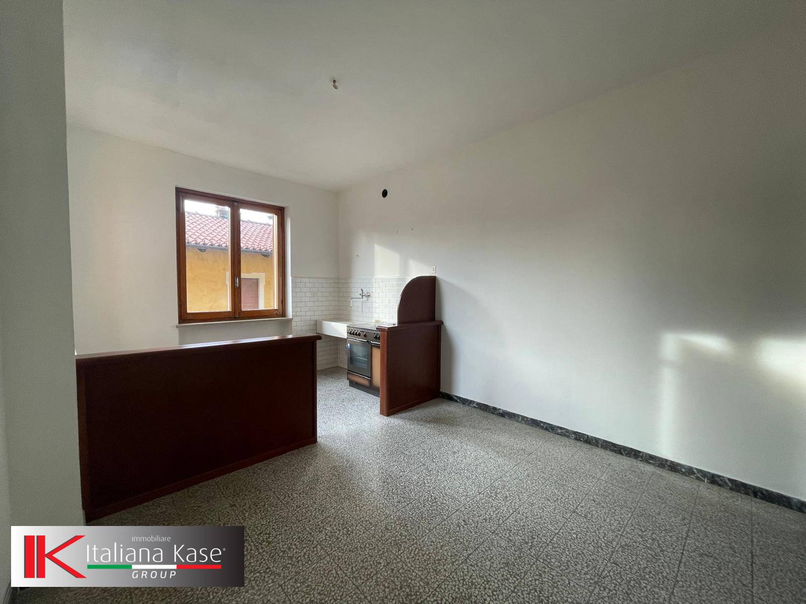 La cucina abitabile e molto luminosa in quanto sono presenti due finestroni con infissi in legno provvisti di vetrocamera.