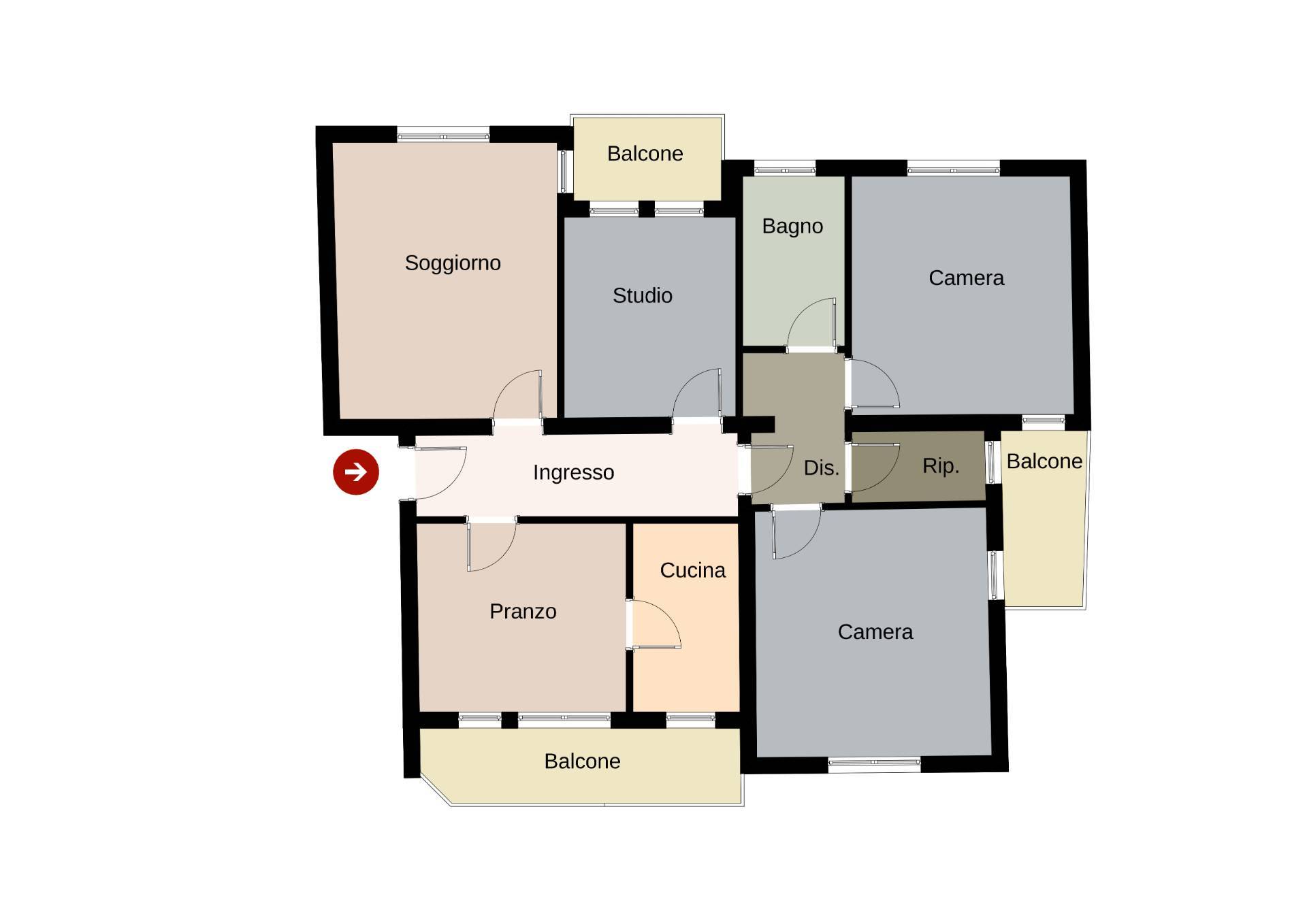L'appartamento, da ristrutturare, si compone di ingresso-corridoio, soggiorno, cucina abitabile, tre camere da letto, bagno, ripostiglio, tre terrazze.