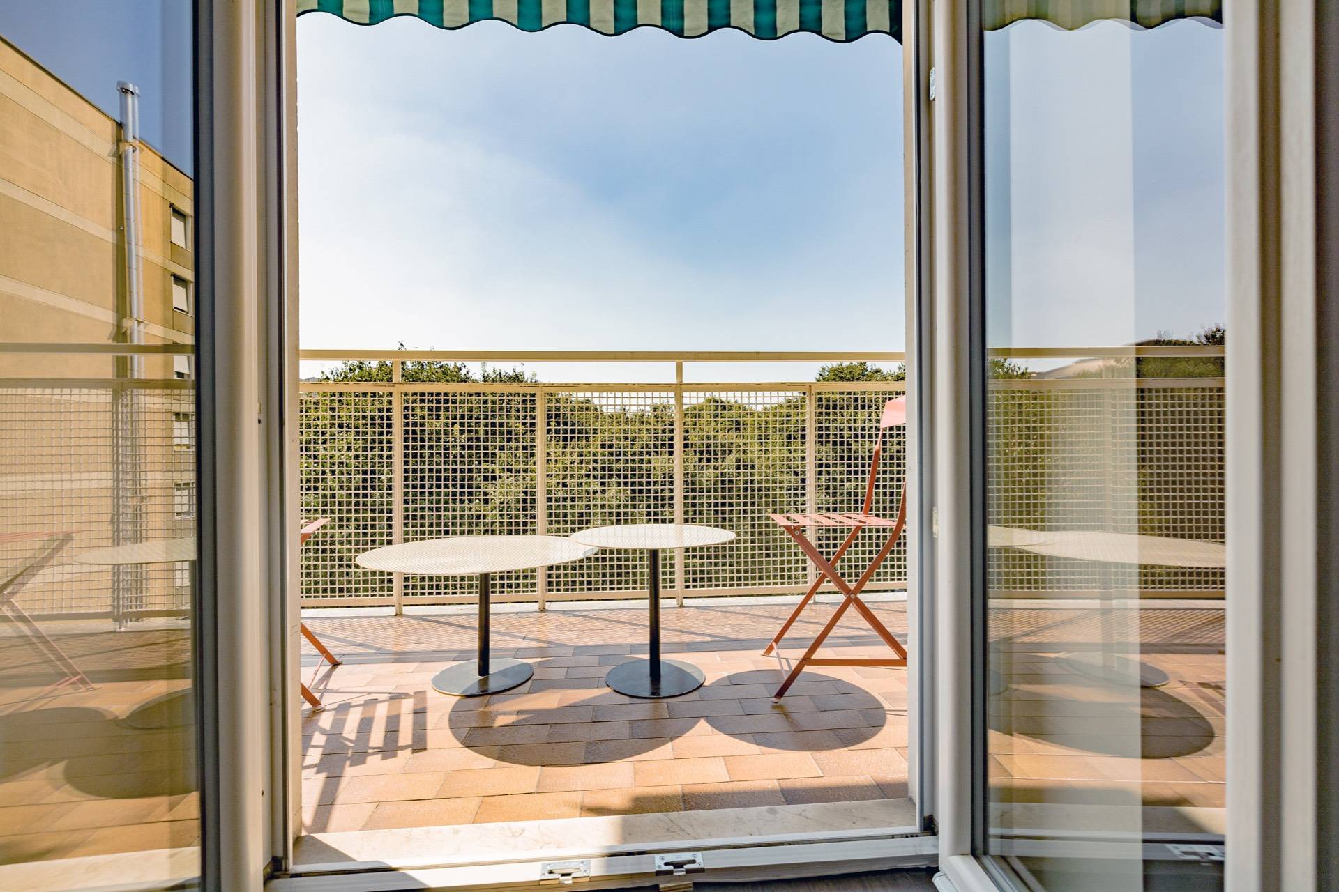 Un moderno bagno con doccia, un ripostiglio/lavanderia e un ampio balcone per goderti la vista panoramica.