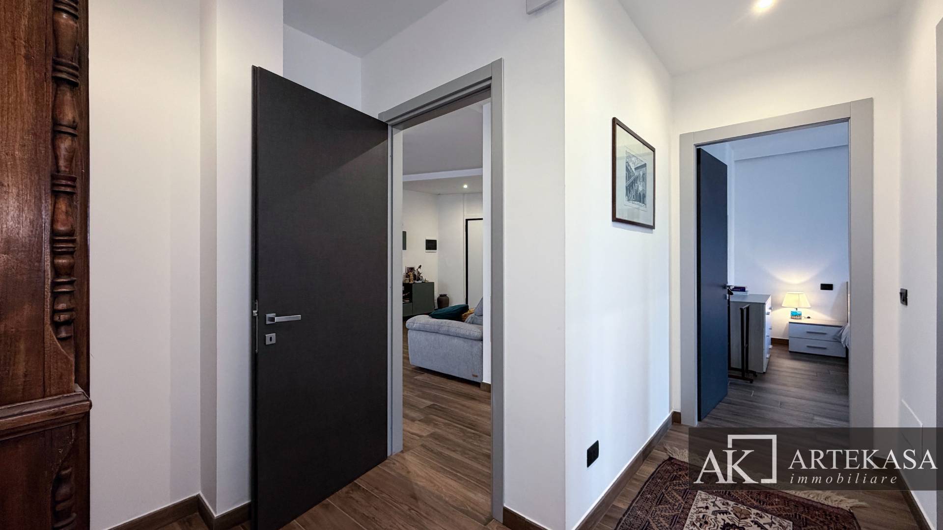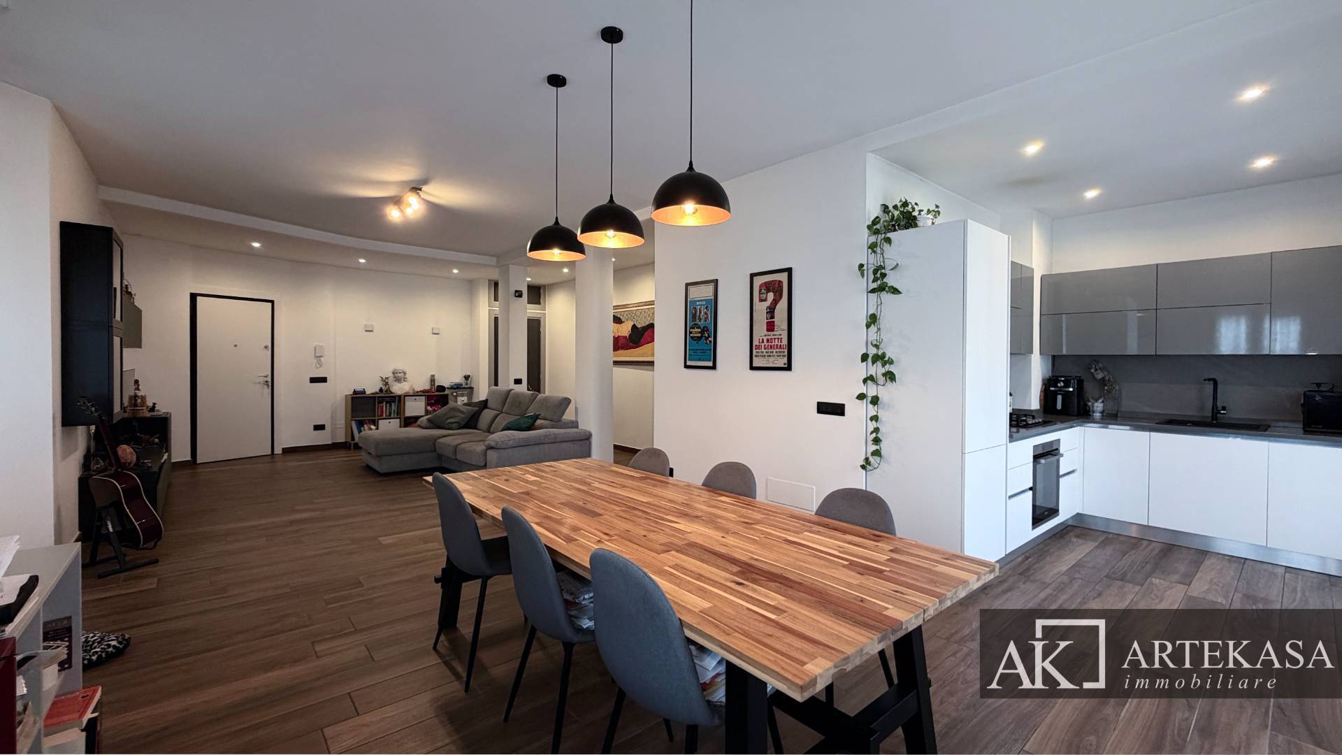 Lappartamento, di circa 105 mq., accoglie con un ampio e luminoso soggiorno con cucina a vista serviti da balcone, ideale per vivere e condividere gli spazi.