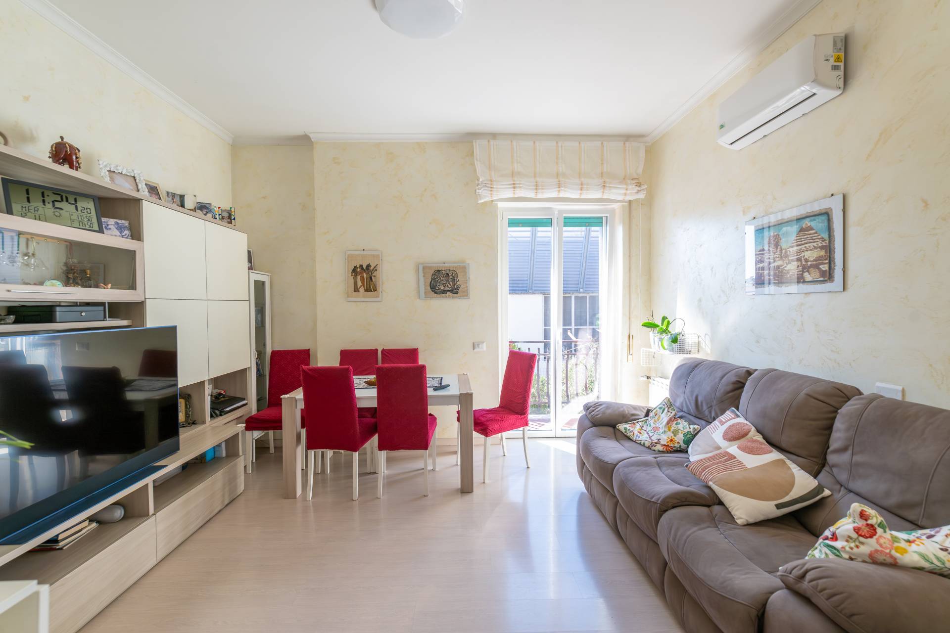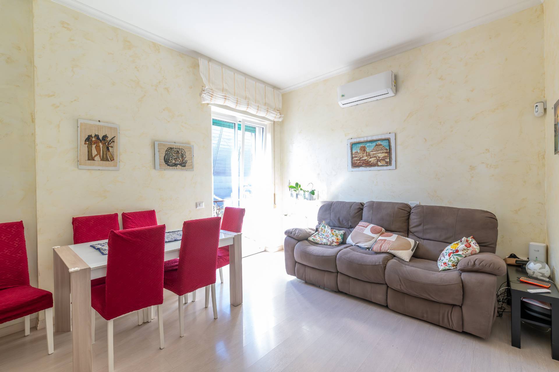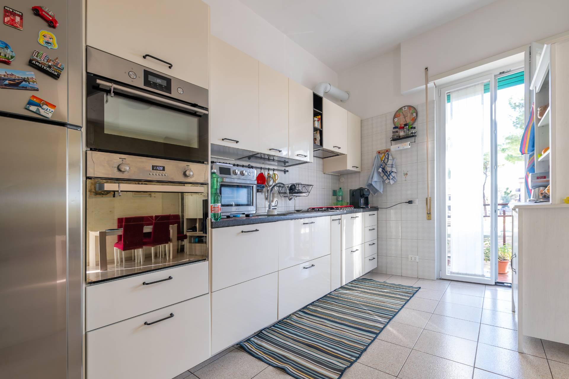 L'appartamento composto da un ampio salone, una cucina abitabile, un disimpegno funzionale, una camera matrimoniale, una seconda camera, un bagno finestrato con doccia e tre balconi, dotato di infissi nuovi, grate di sicurezza e impianto di climatizzazione.