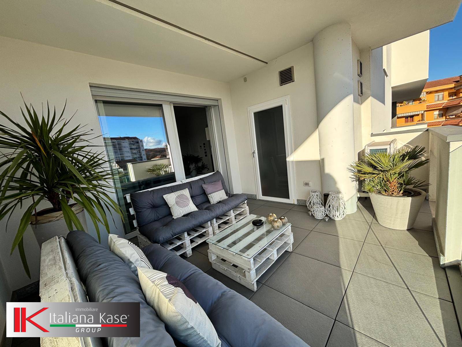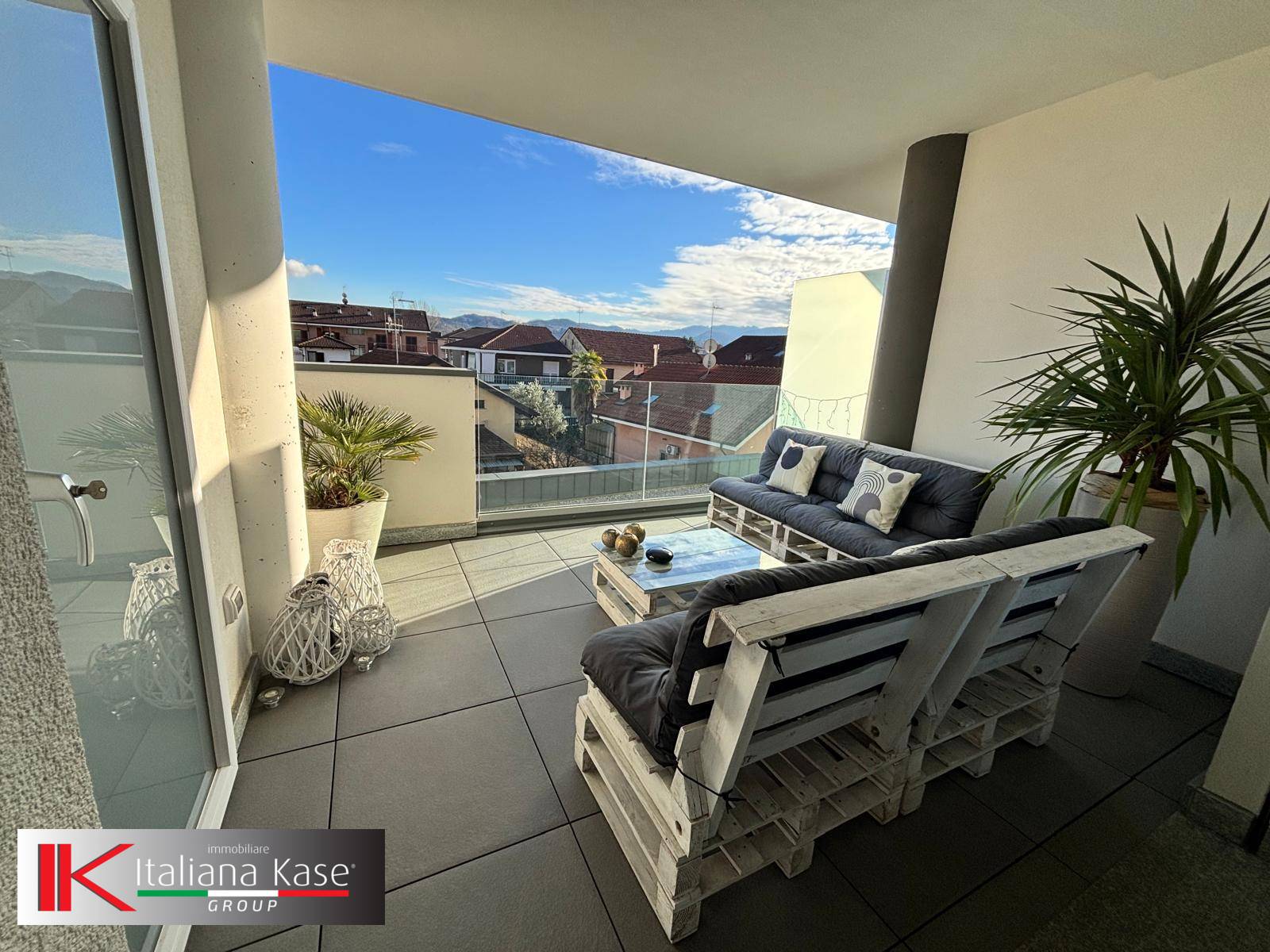 L'appartamento si sviluppa con ingresso living su soggiorno con cucina a vista ed uscita sulla terrazza vetrata con vista sulla collina, lavanderia, camera con balcone, cameretta e bagno.