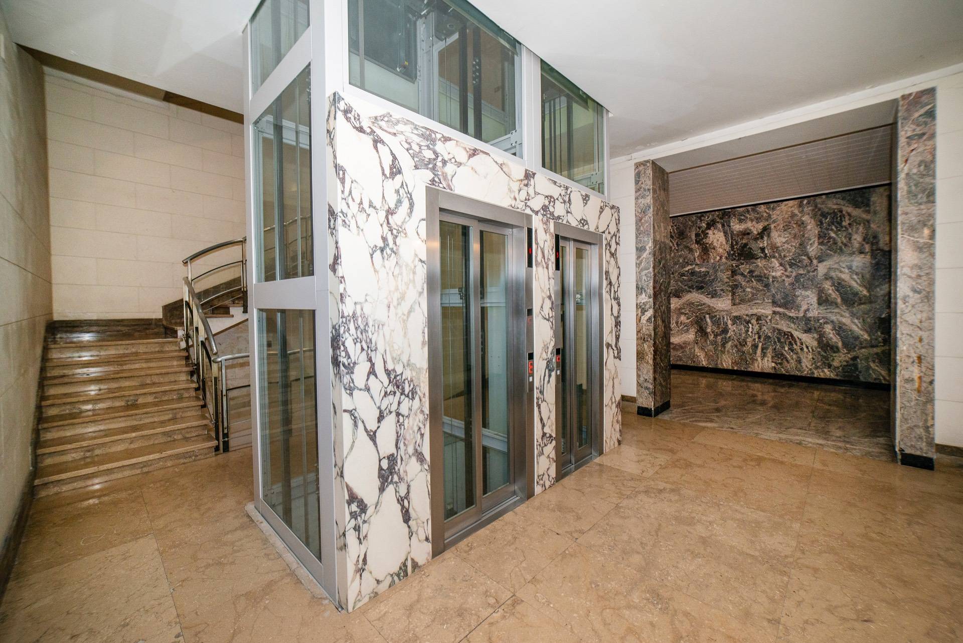 La narrazione architettonica guidata dall'uso sapiente di marmi pregiati di varie essenze, alternati ad inserti in acciaio a specchio: lampi di luce tra le profondit proprie del cristallo, trasparente o serigrafato a seconda del percorso.