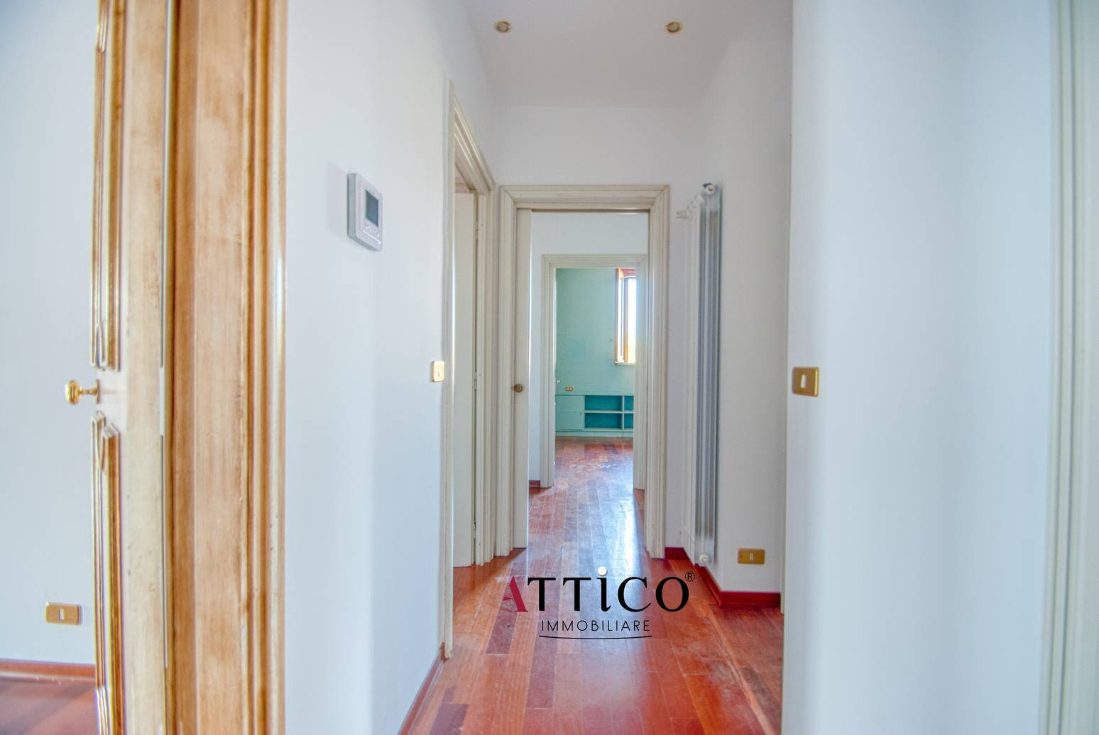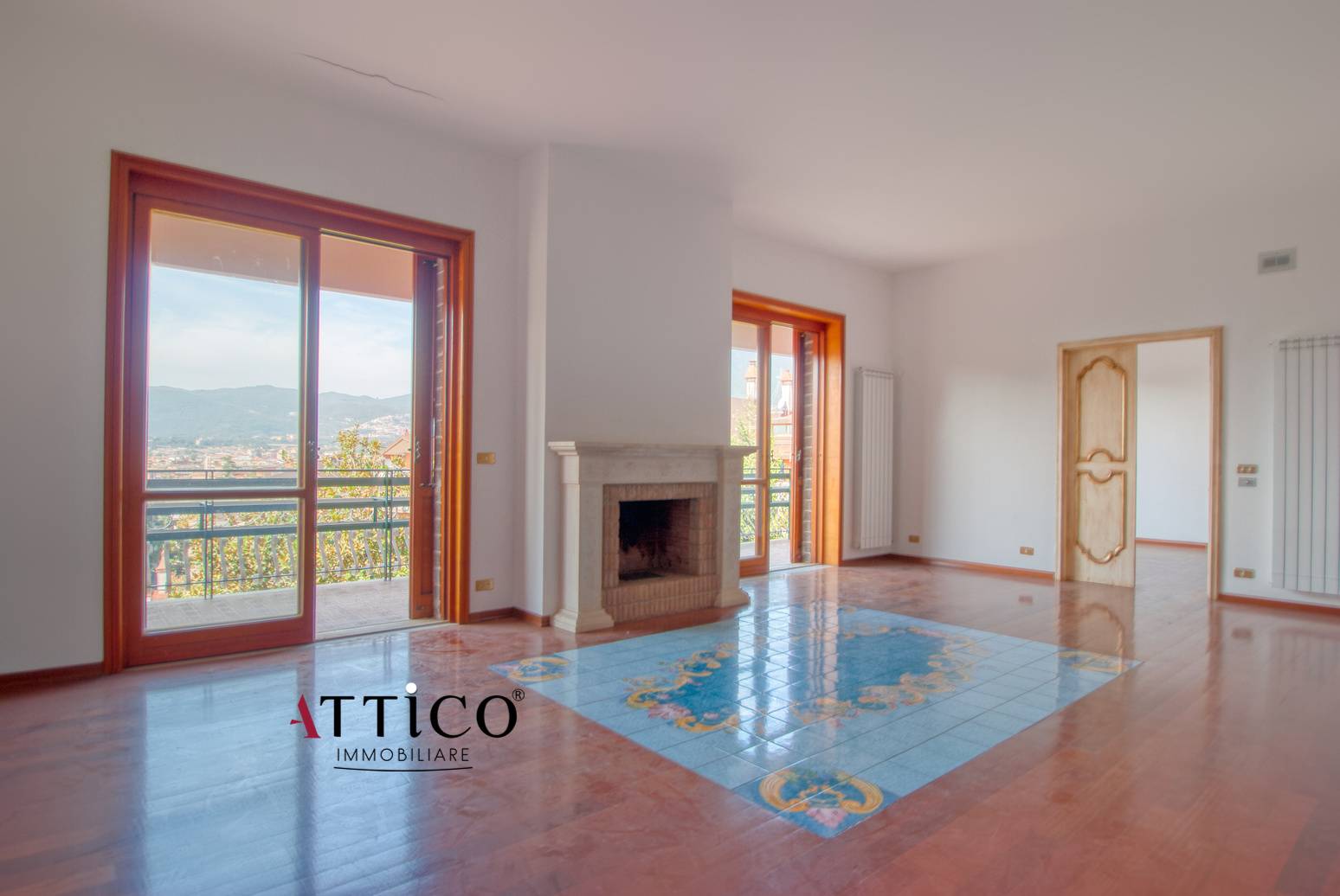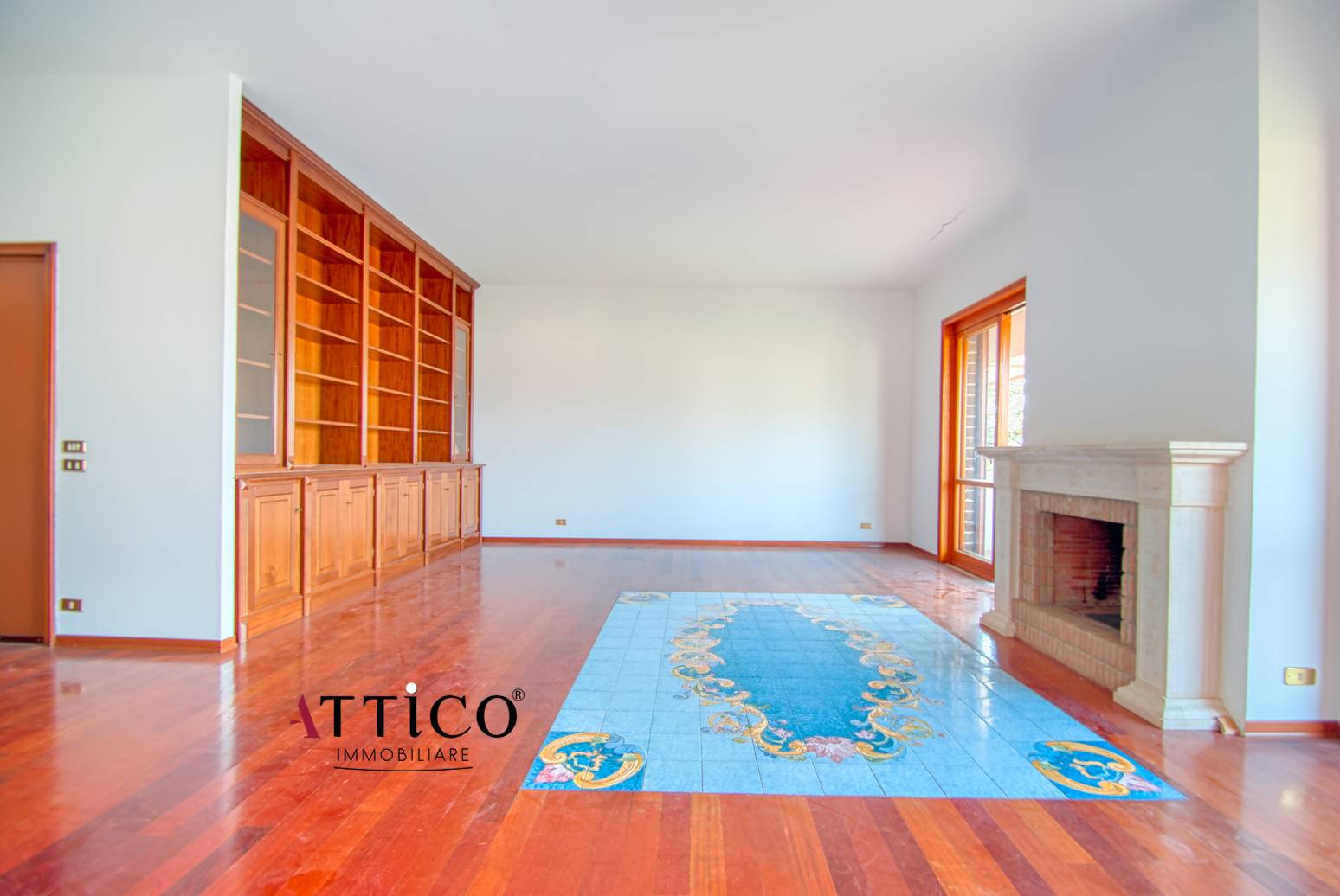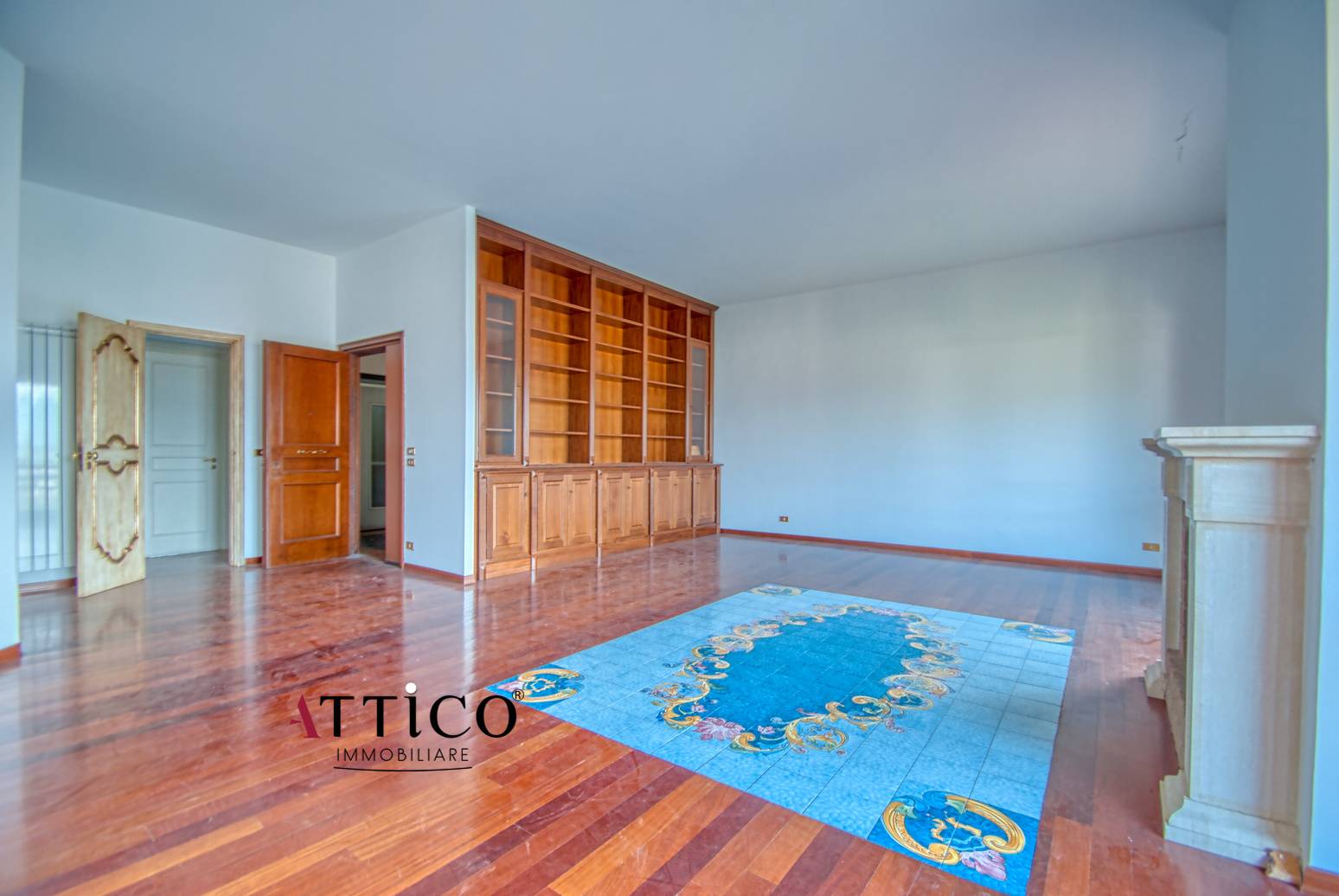 L'immobile, con triplice esposizione e totalmente parquettato, composto da ingresso, salone doppio con camino, tre camere da letto, cucina abitabile e due bagni.