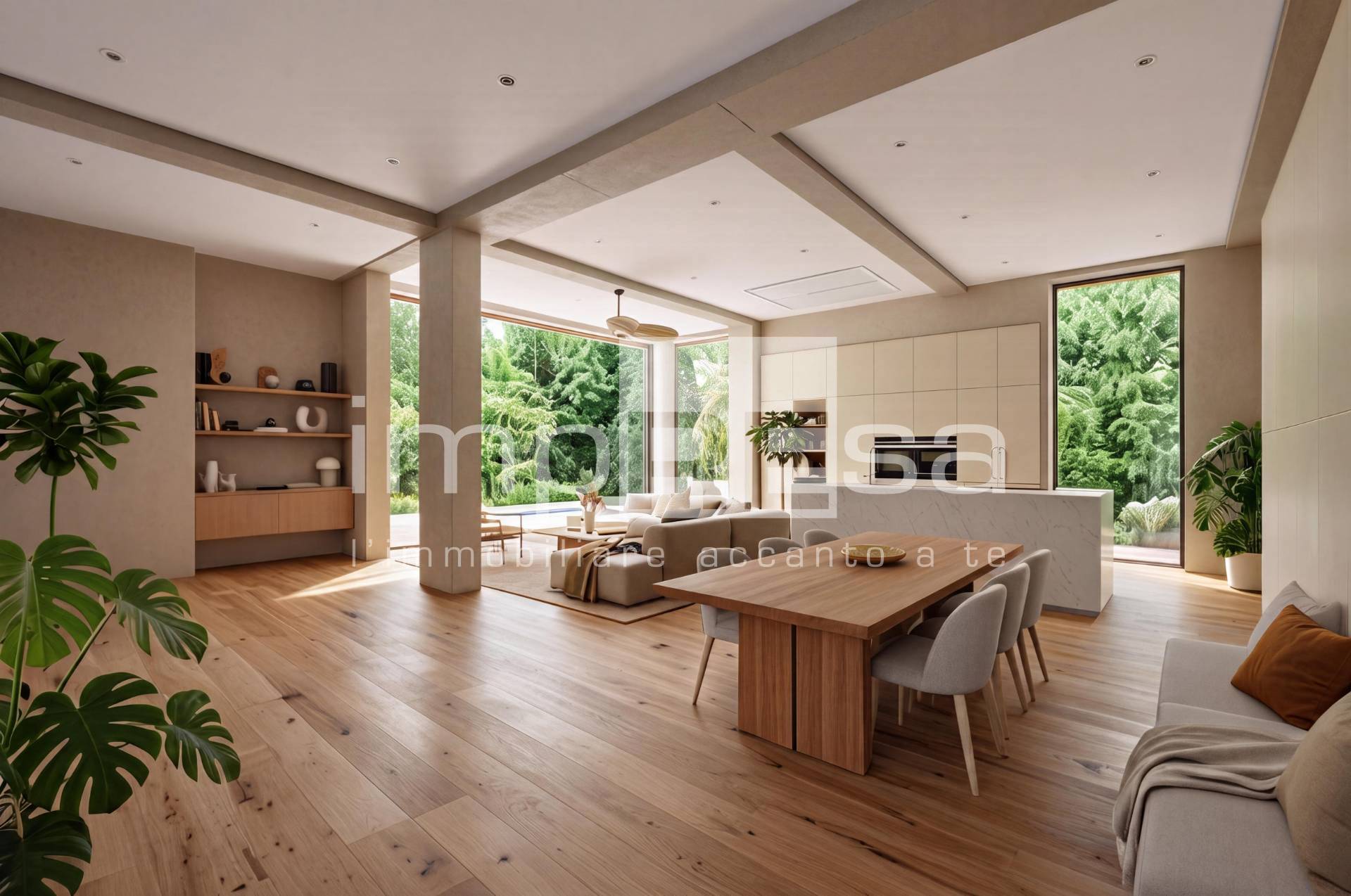 Al piano terra la zona giorno di 50mq composta da una bella zona cucina ed un'ampio soggiorno con una vetrata ampia che permette di accedere alla zona del portico dove poter godersi della bella stagione.