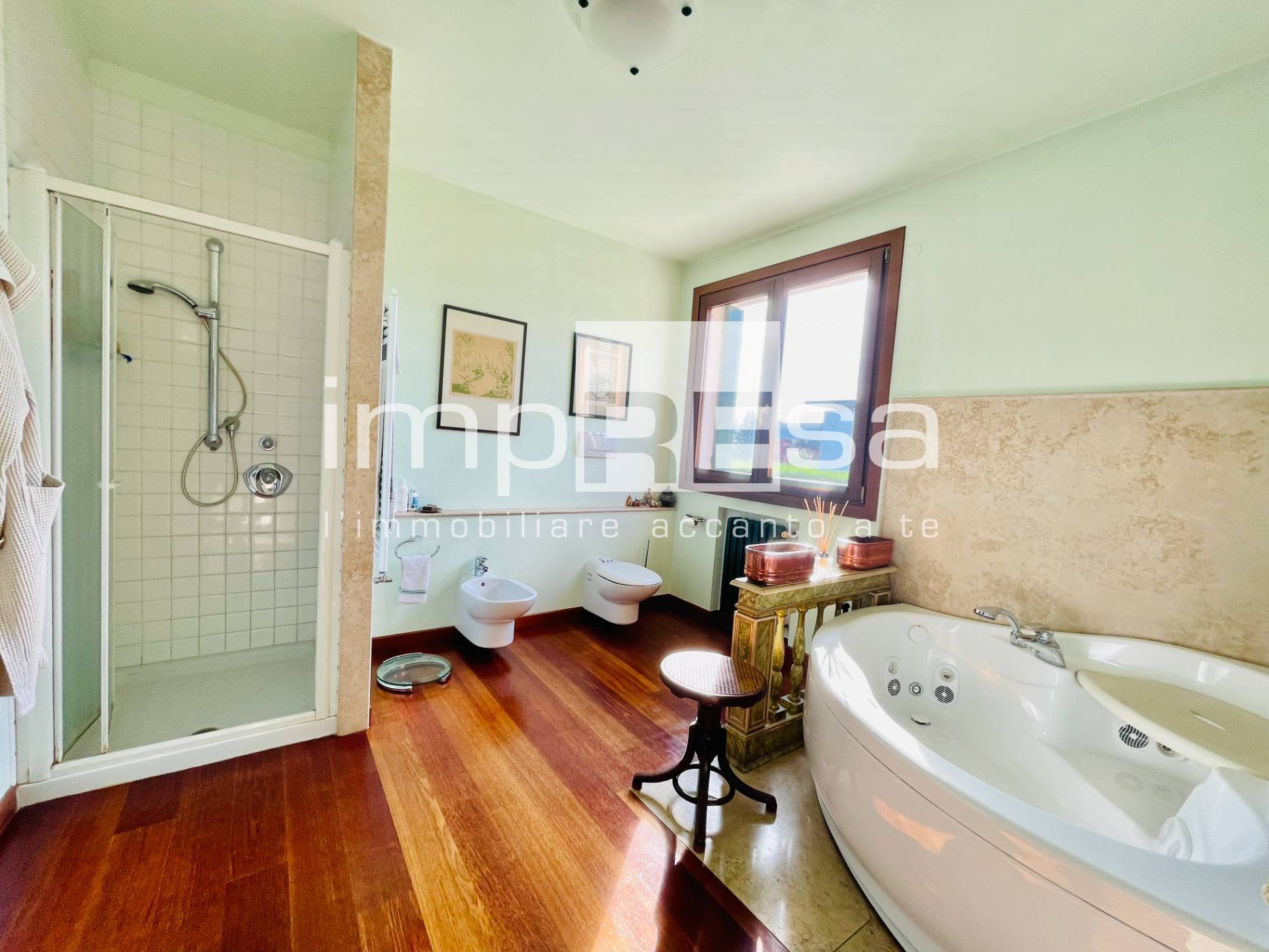 al piano superiore tre camere un generoso bagno con vasca idromassaggio e doccia, ampia zona relax al piano semi interrato taverna, lavanderia, bagno con doccia e sauna, garage doppio.
