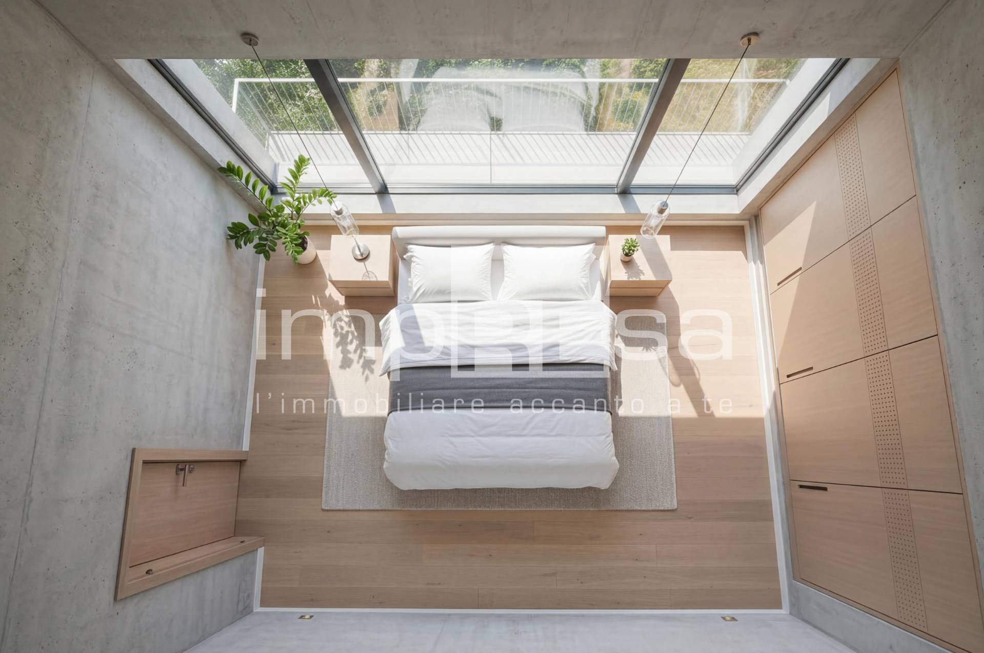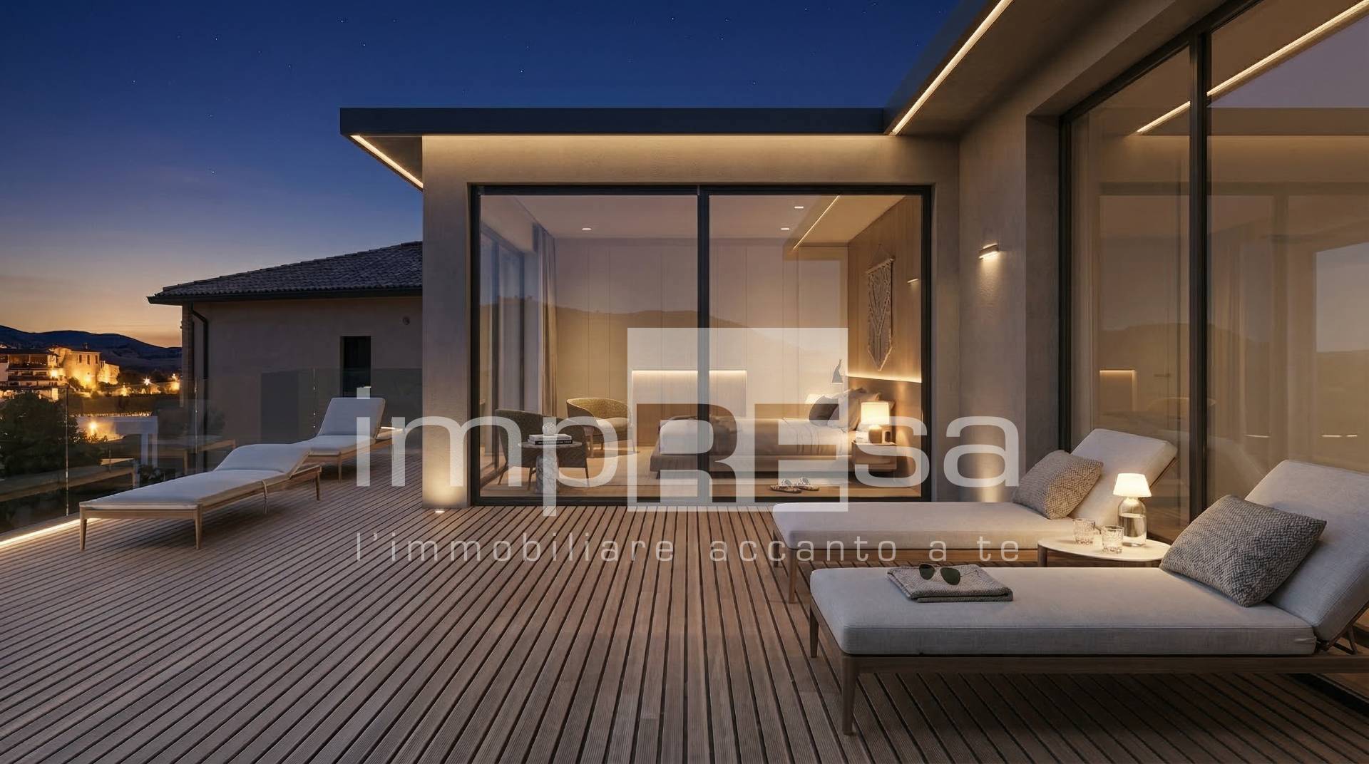 La zona notte al piano superiore si compone di due camere da letto servite da un bagno e da un ampio terrazzo con affaccio esterno.
