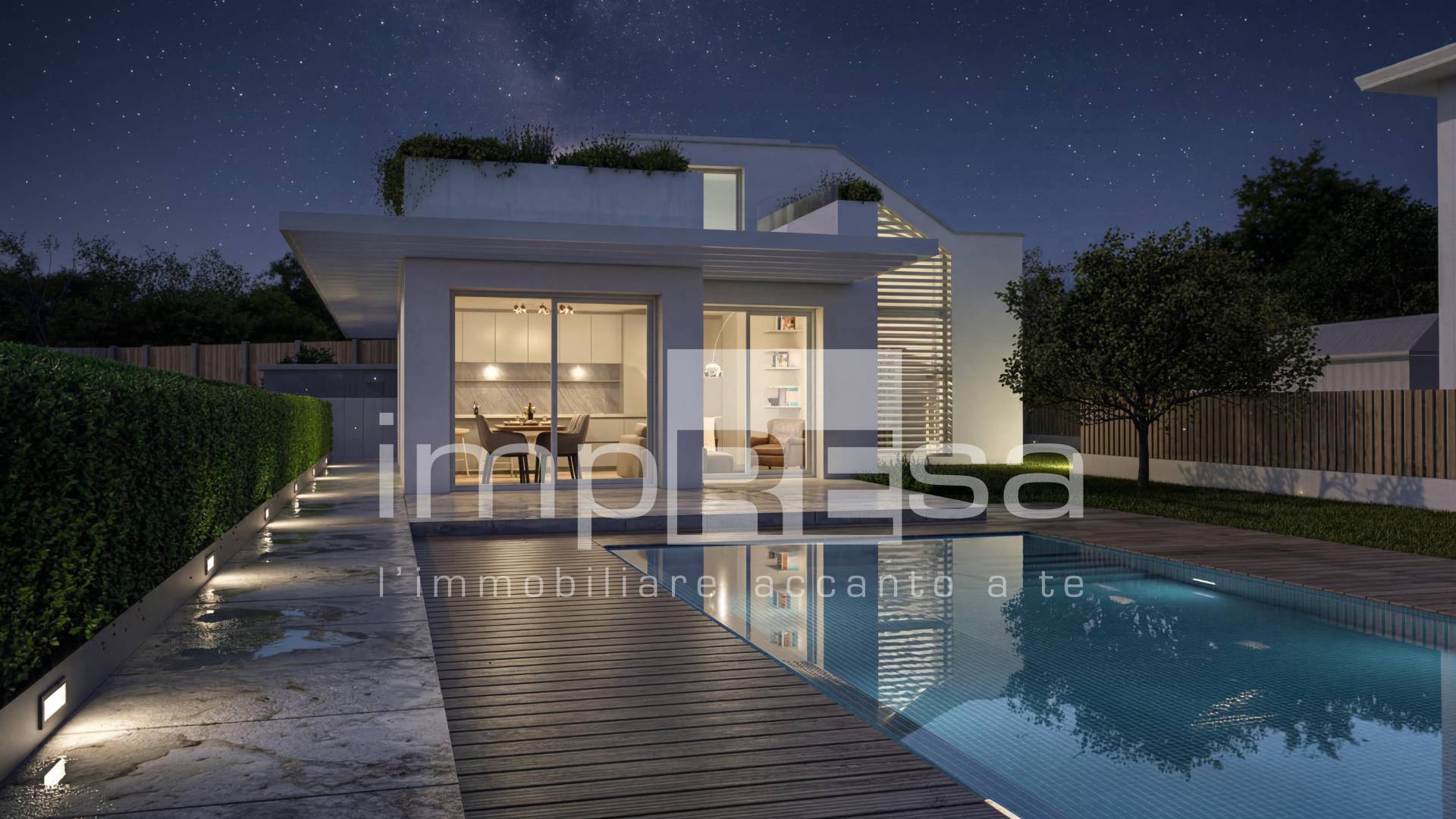 Il piano terra accoglie una zona giorno con cucina a vista, caratterizzata da ampie vetrate che integrano visivamente l'interno con il giardino privato.