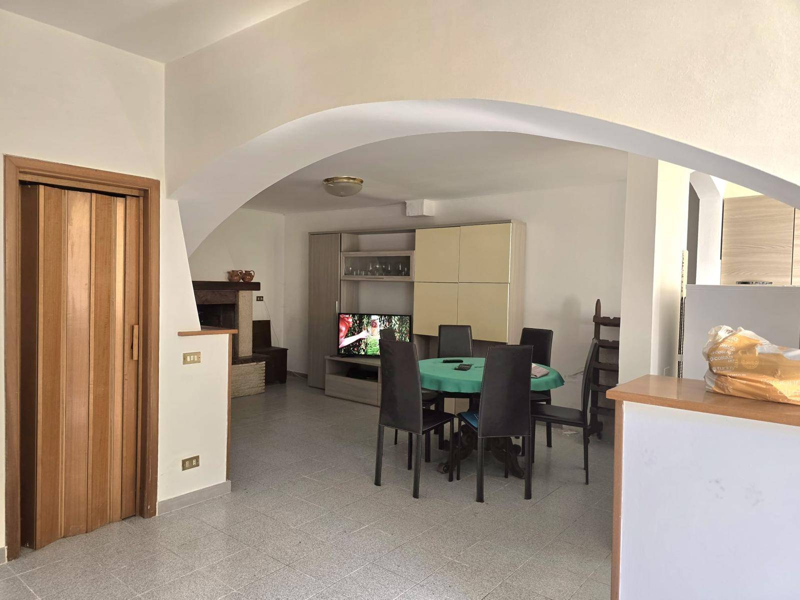 L'ingresso privato si apre su un ampio e luminoso soggiorno impreziosito da un caratteristico camino, perfetto per creare un'atmosfera calda e accogliente.