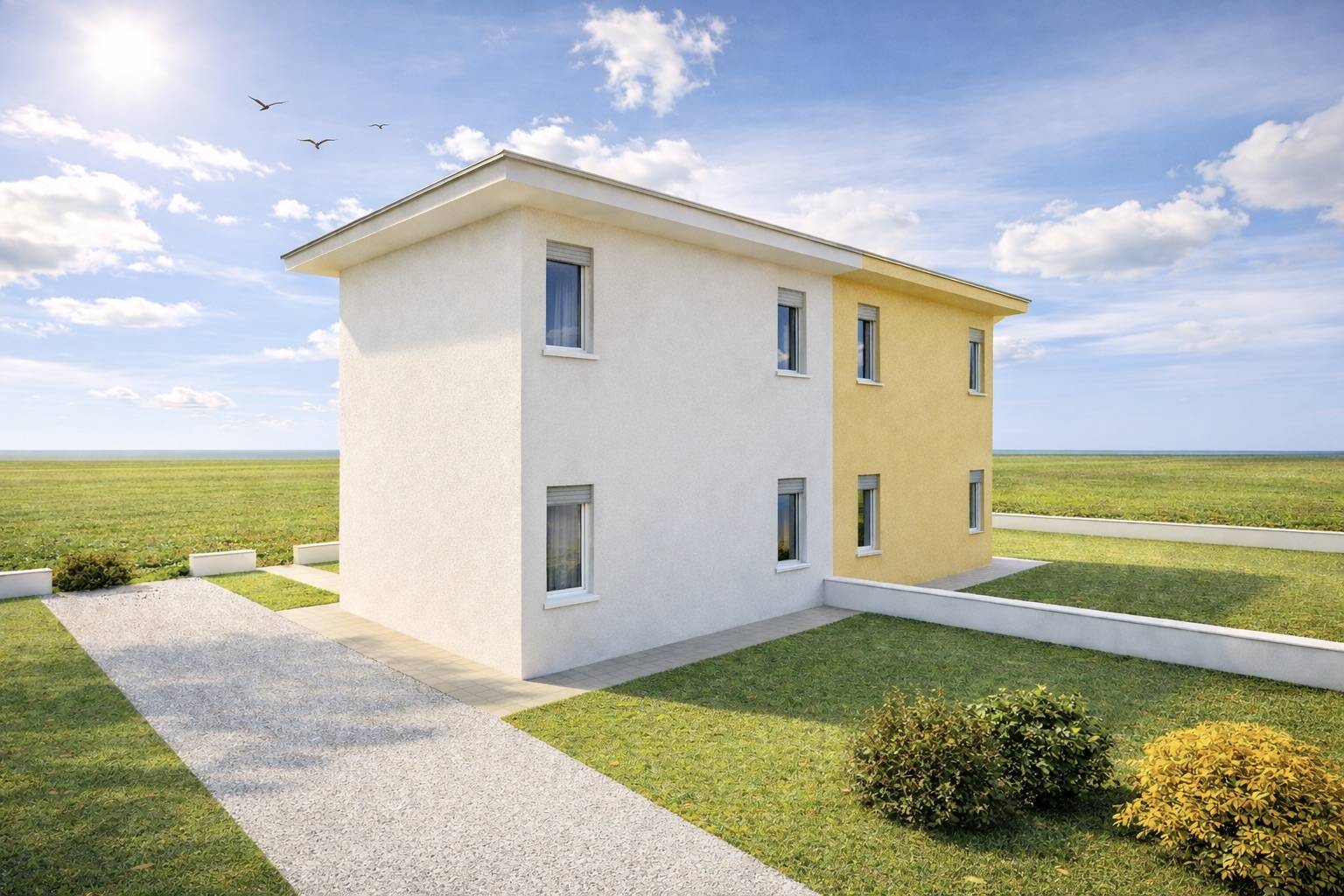 Al piano terra laccesso avviene tramite portico che conduce alla zona giorno con soggiorno cucina e pranzo in ambiente unico, ripostiglio e bagno, mentre al piano primo trovano spazio una camera, un disimpegno ad uso guardaroba, un secondo bagno e una comoda loggia.