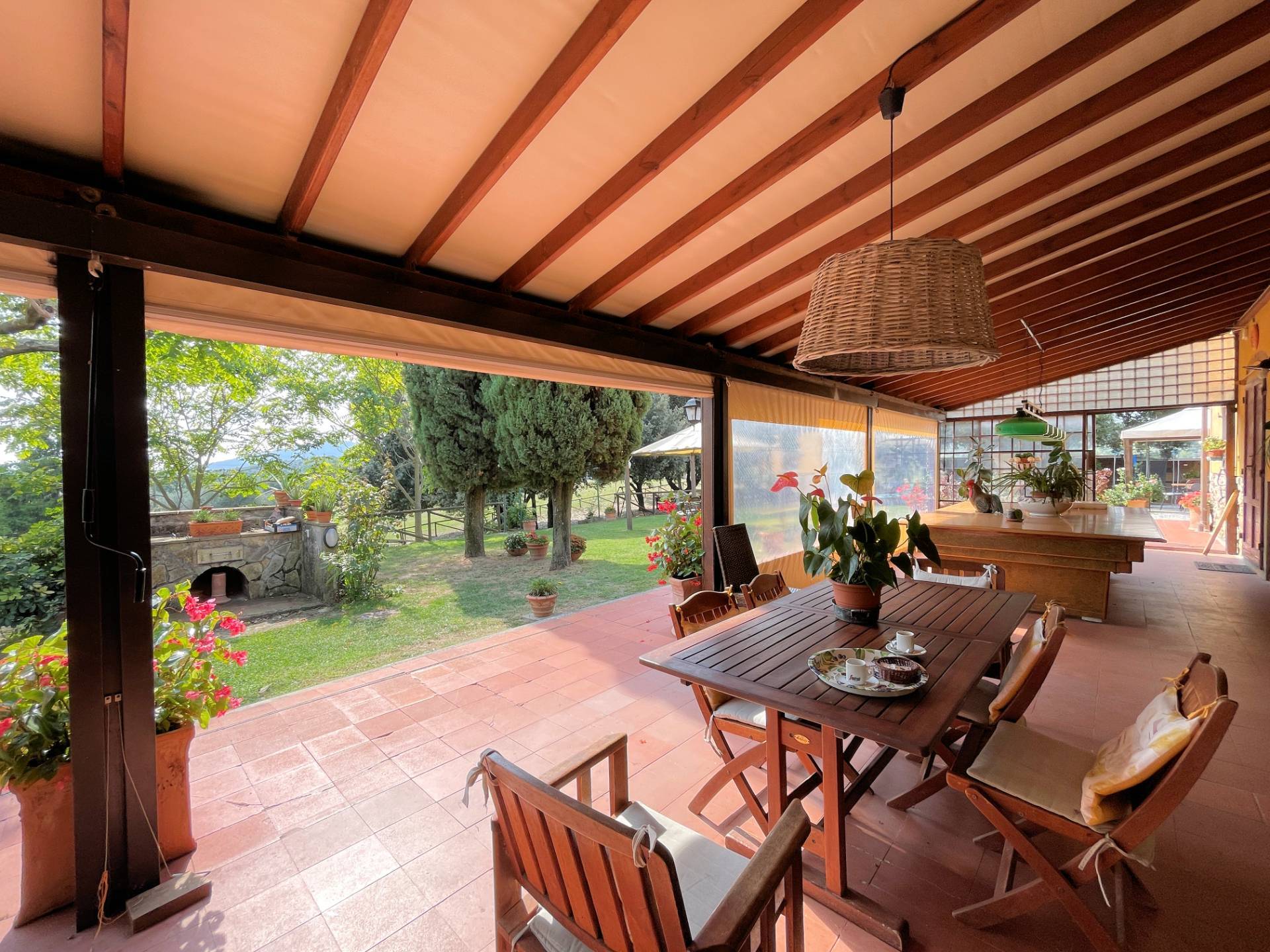 L'immobile stato ristrutturato, e all'esterno c' una meravigliosa veranda che circonda tutta la propriet e si affaccia sul giardino antistante e sul boschetto.