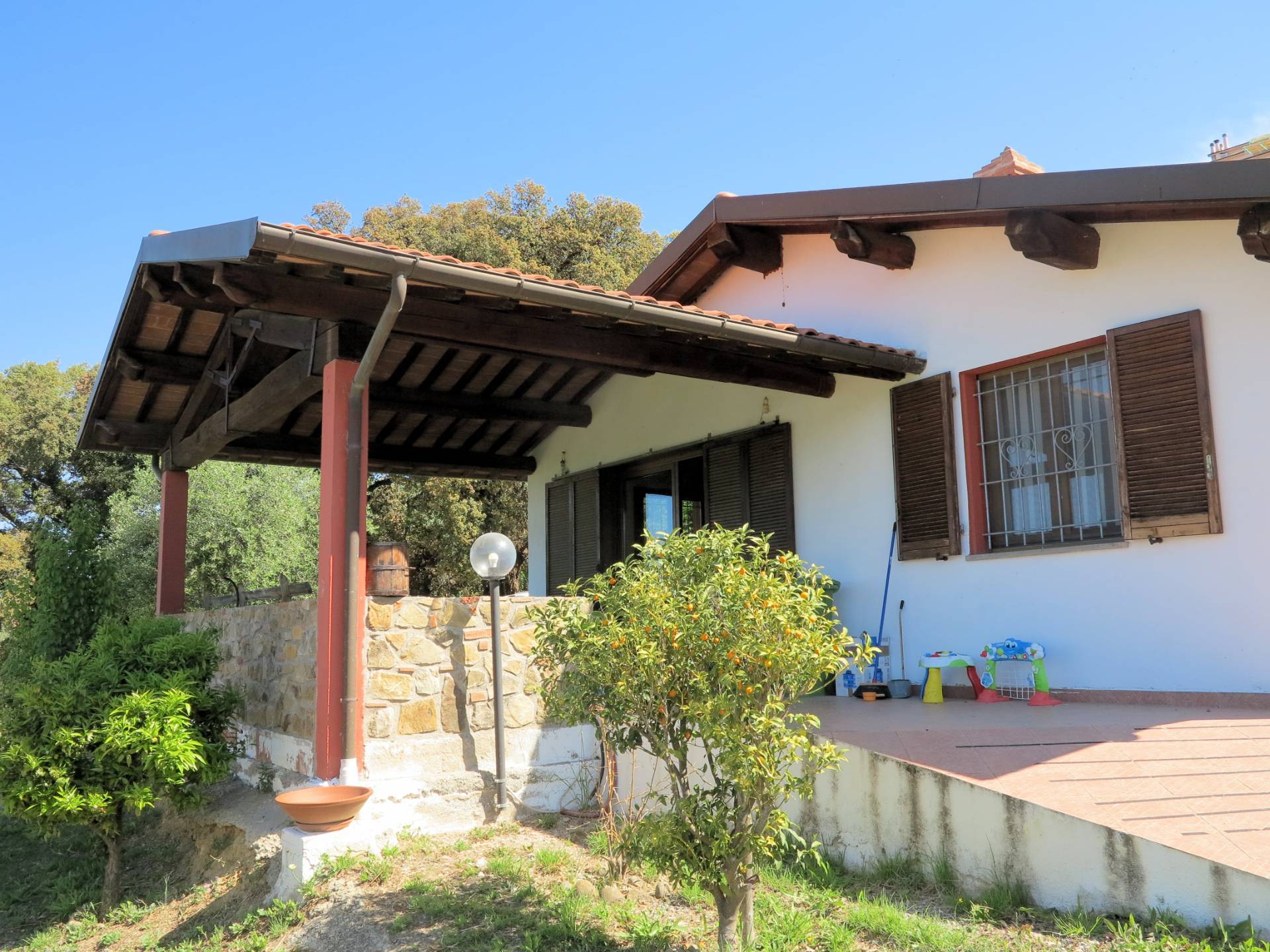 In splendida posizione con vista mare in posizione pedecollinare nel comune di Scarlino vicinissimo al mare. L'annesso agricolo in perfette condizioni in posizione dominante con un grande porticato in legno.