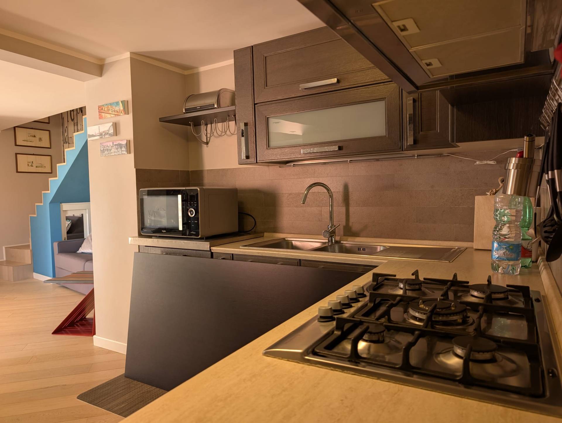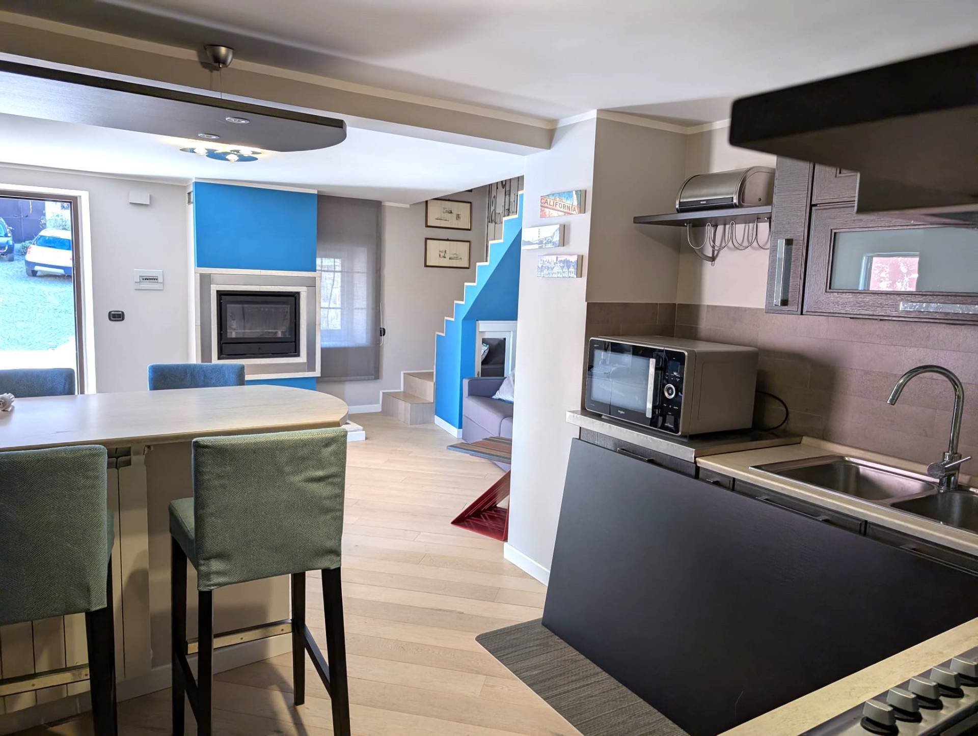 L'architetto che ha eseguito i lavori di ristrutturazione ha ricavato al piano terra rialzato un bellissima zona giorno con un soggiorno a vista ed un angolo cottura con adiacente il servizio igienico.