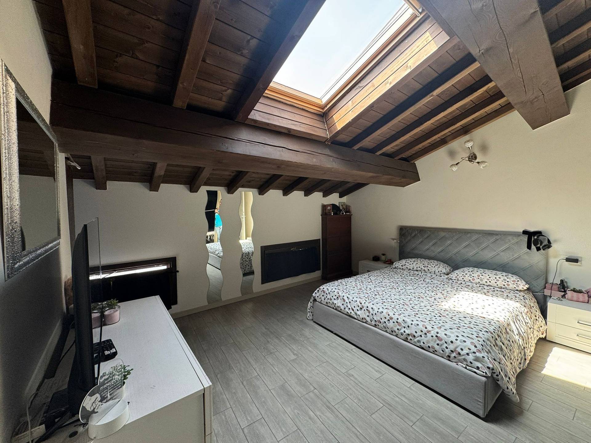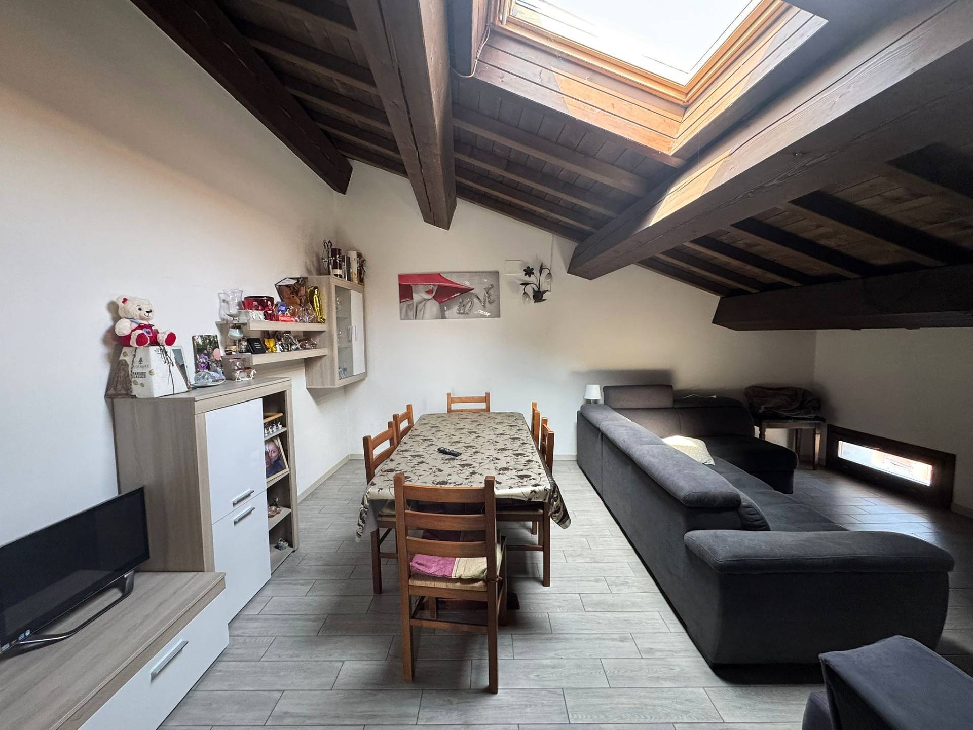 Limmobile si distingue per gli spazi generosi e la grande luminosit, valorizzati dalla presenza di splendide travi a vista che donano calore e carattere agli ambienti.