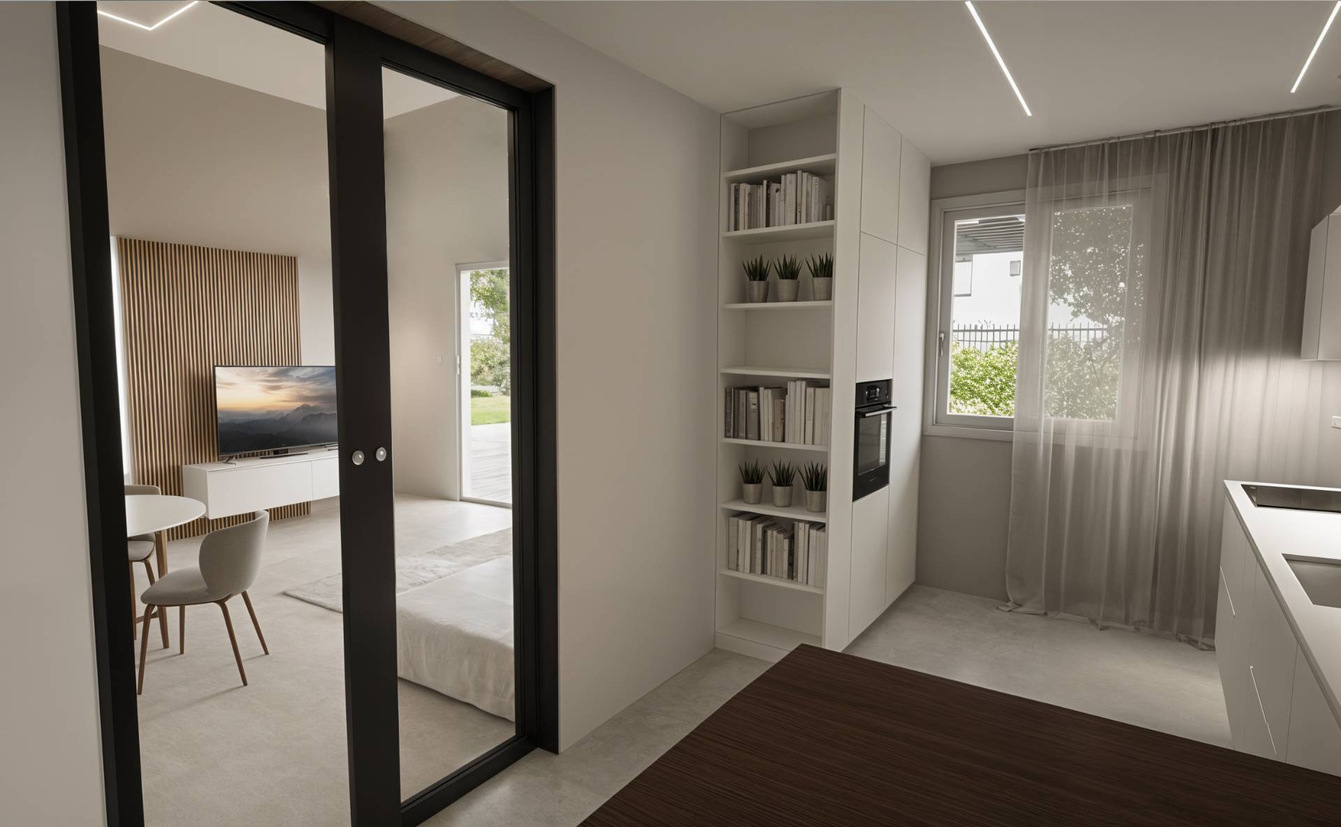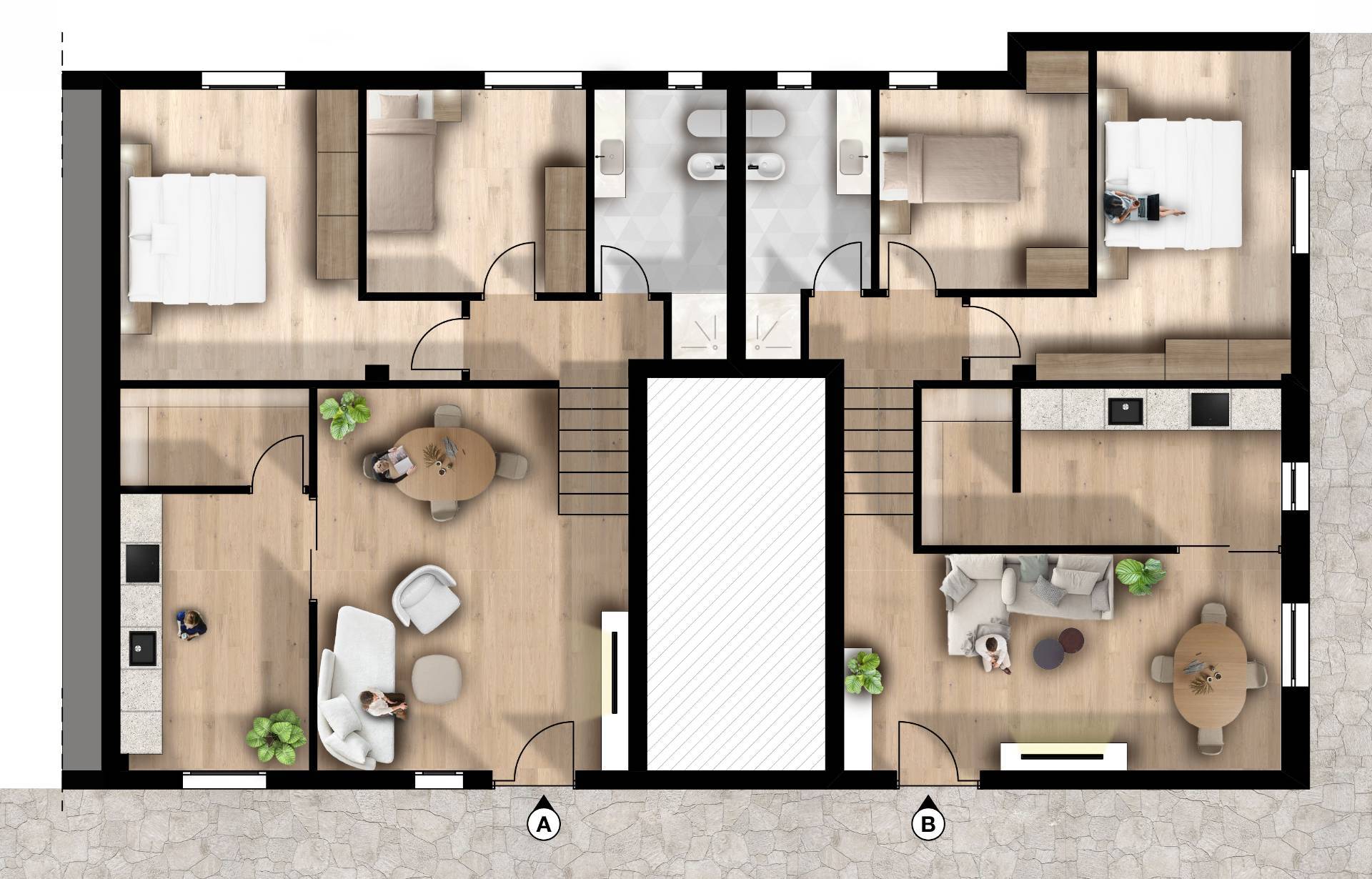 Si compongono da Ingresso, Grande e Luminoso Soggiorno, Cucina Abitabile, 2 Camere da Letto e Bagno.