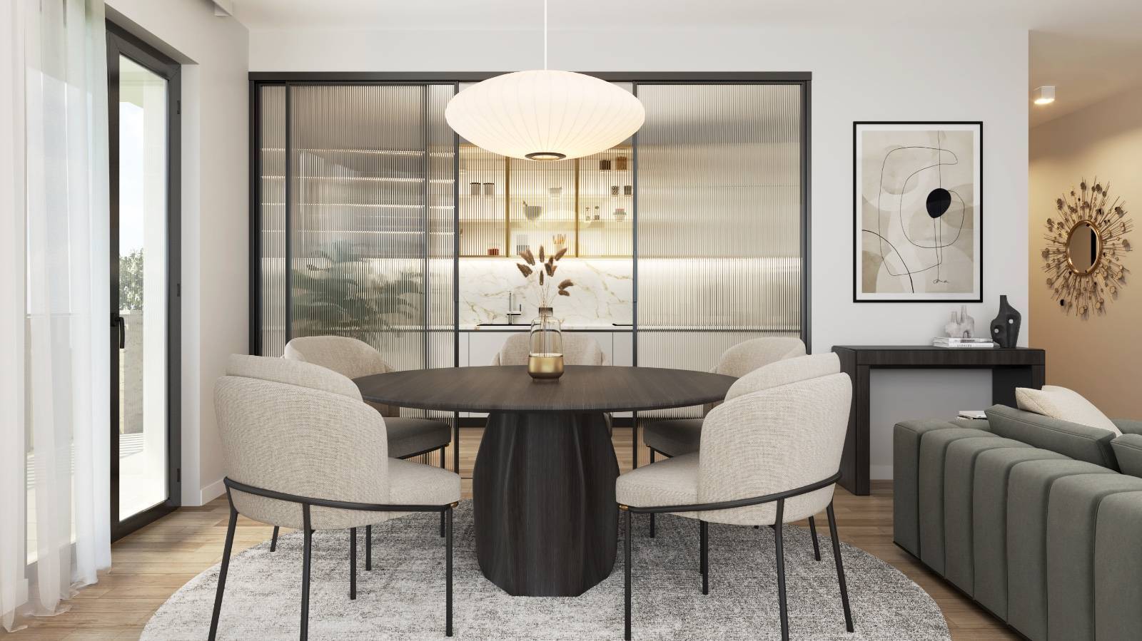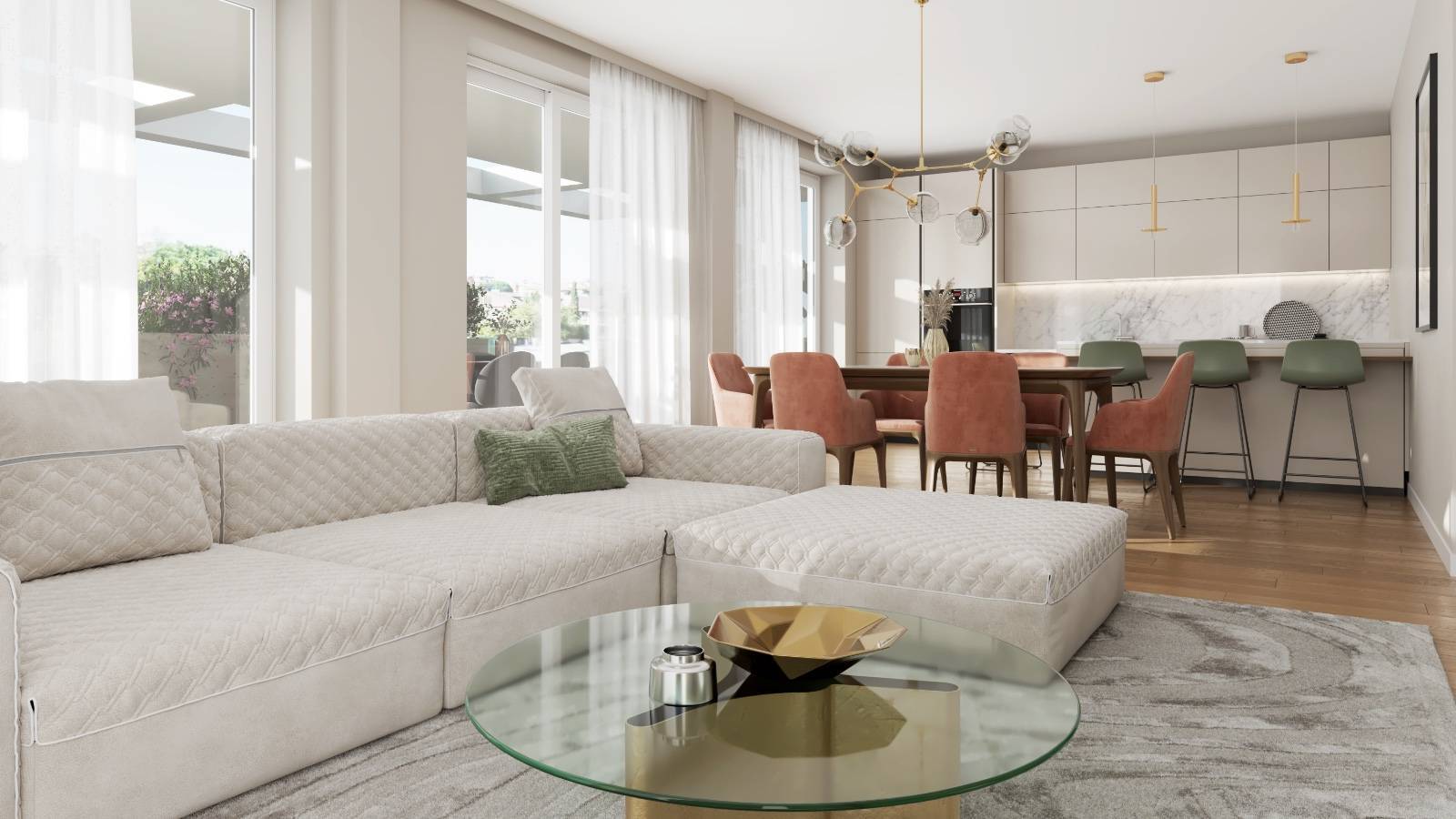 La distribuzione interna degli spazi prevede una magnifica zona living di circa 60 mq, completata da una serra bioclimatica, di circa 21 mq, che contribuisce al miglioramento del bilancio energetico dell'attico.