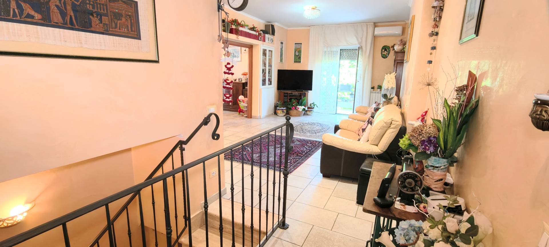Piano rialzato cos composto: ingresso, salone doppio, sala da pranzo con porta finestra sul balcone (dove possibile ricavare un ampia camera da letto al piano), grande cucina con uscita diretta su di un delizioso giardino di propriet esclusiva di circa mq. 250, con ingresso indipendente, ideale per trascorrere momenti di convivialit in famiglia e con gli amici, bagno finestrato ed altri due balconi.