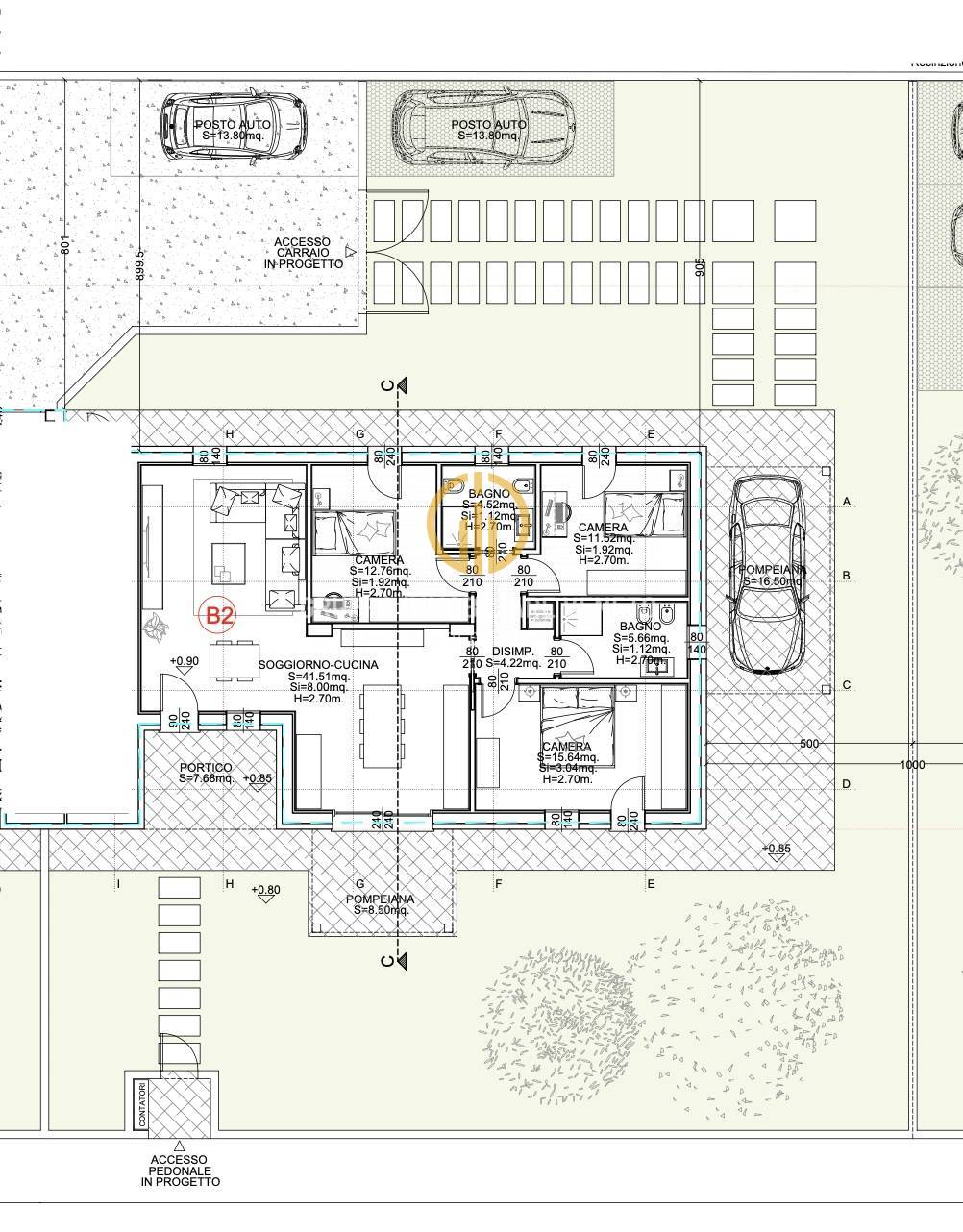 Gli spazi interni sono pensati per offrire comfort e funzionalit: Zona giorno di mq 41 ampia e luminosa con affaccio sulla loggia e pompeiana, ideale per la vita quotidiana e i momenti conviviali; tre camere da letto, accoglienti e silenziose, perfette per il tuo riposo e due bagni finestrati.