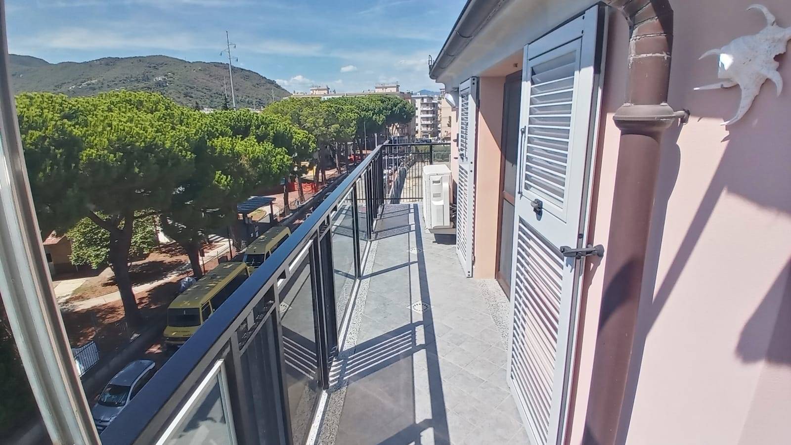 Vista aperta e molto ben esposto con un balcone che corre lungo tutto il perimetro dell'alloggio e si allarga in un terrazzino attrezzato di tavolo, panche e tenda sole per godere delle giornate di sole autunnali e primaverili tipiche della nostra regione.