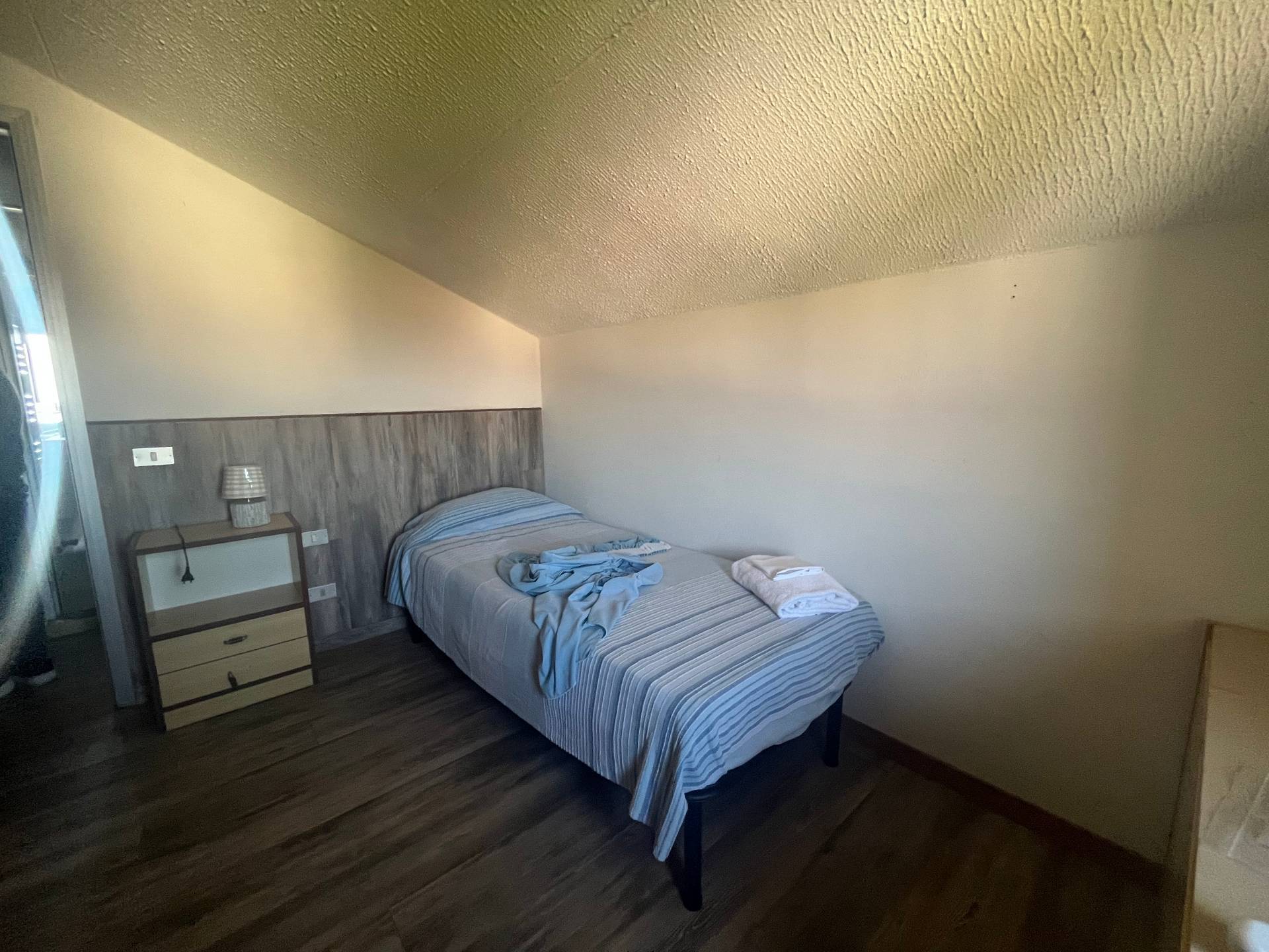 l'appartamento composto da grande sala con caminetto e angolo cottura, due camere, due ripostigli molto grandi nel sottotetto e bagno con doccia e finestra.
