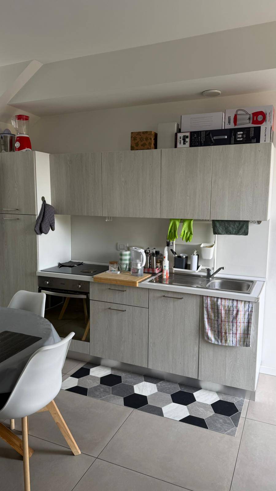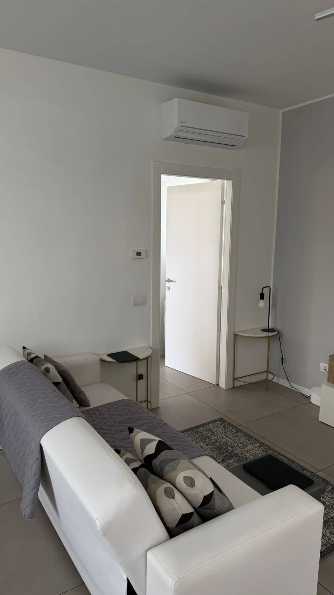 L'appartamento, finemente arredato, composto da soggiorno con angolo cottura con fornello a induzione, zona pranzo con divano letto, bagno dotato di sanitari sospesi, box doccia, mobile lavabo e scalda salviette, antibagno per lavatrice e asciugatrice e camera matrimoniale con armadio a tre ante, due comodini.