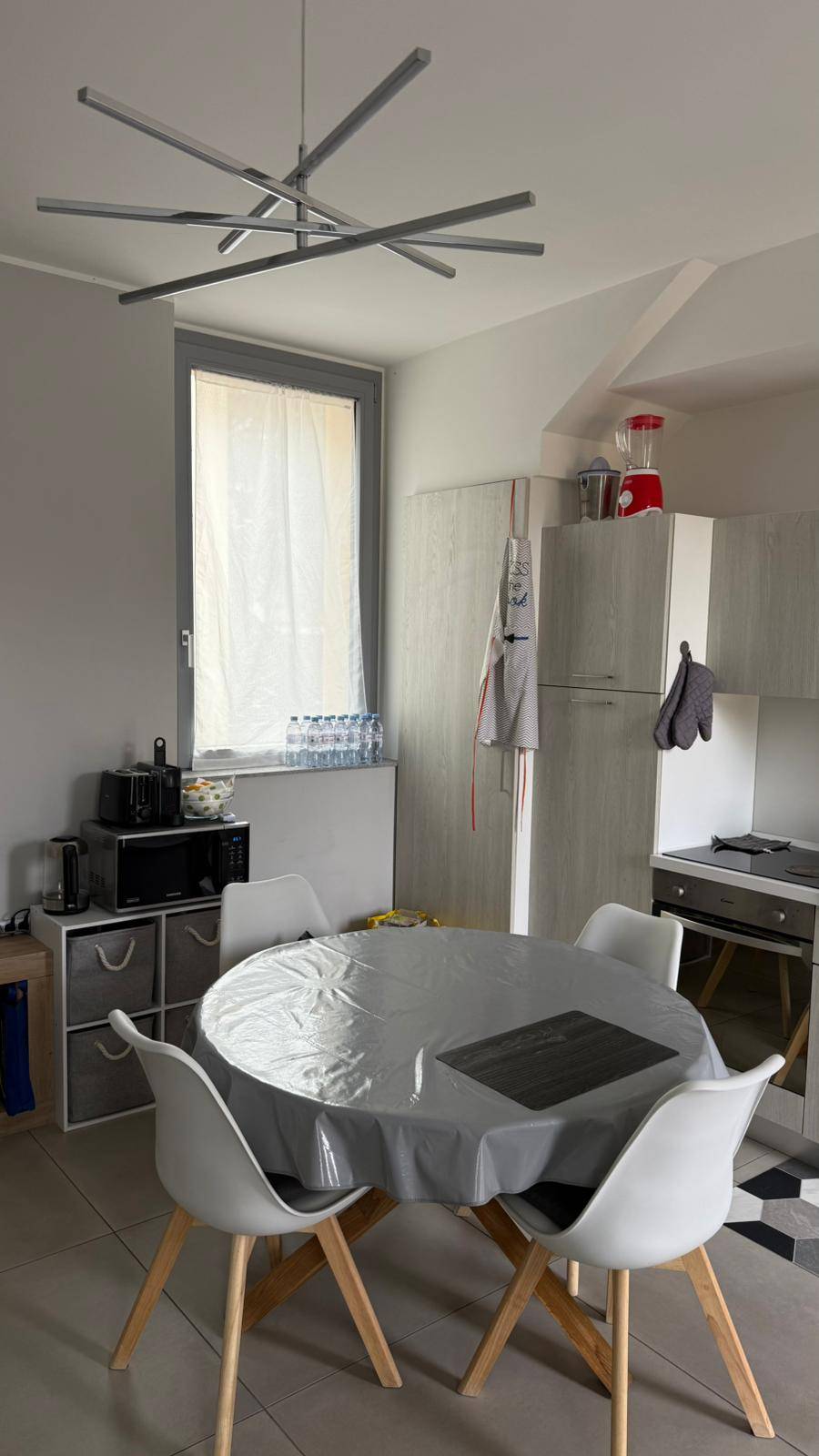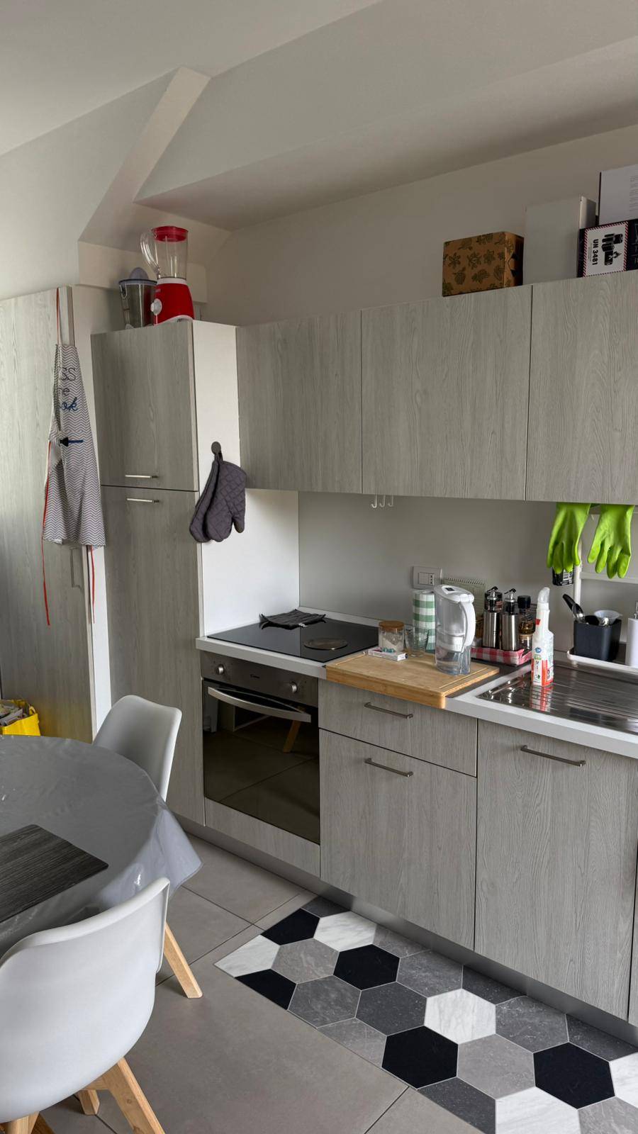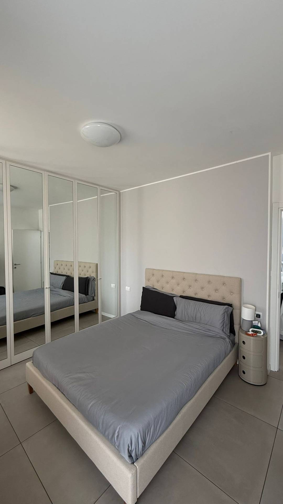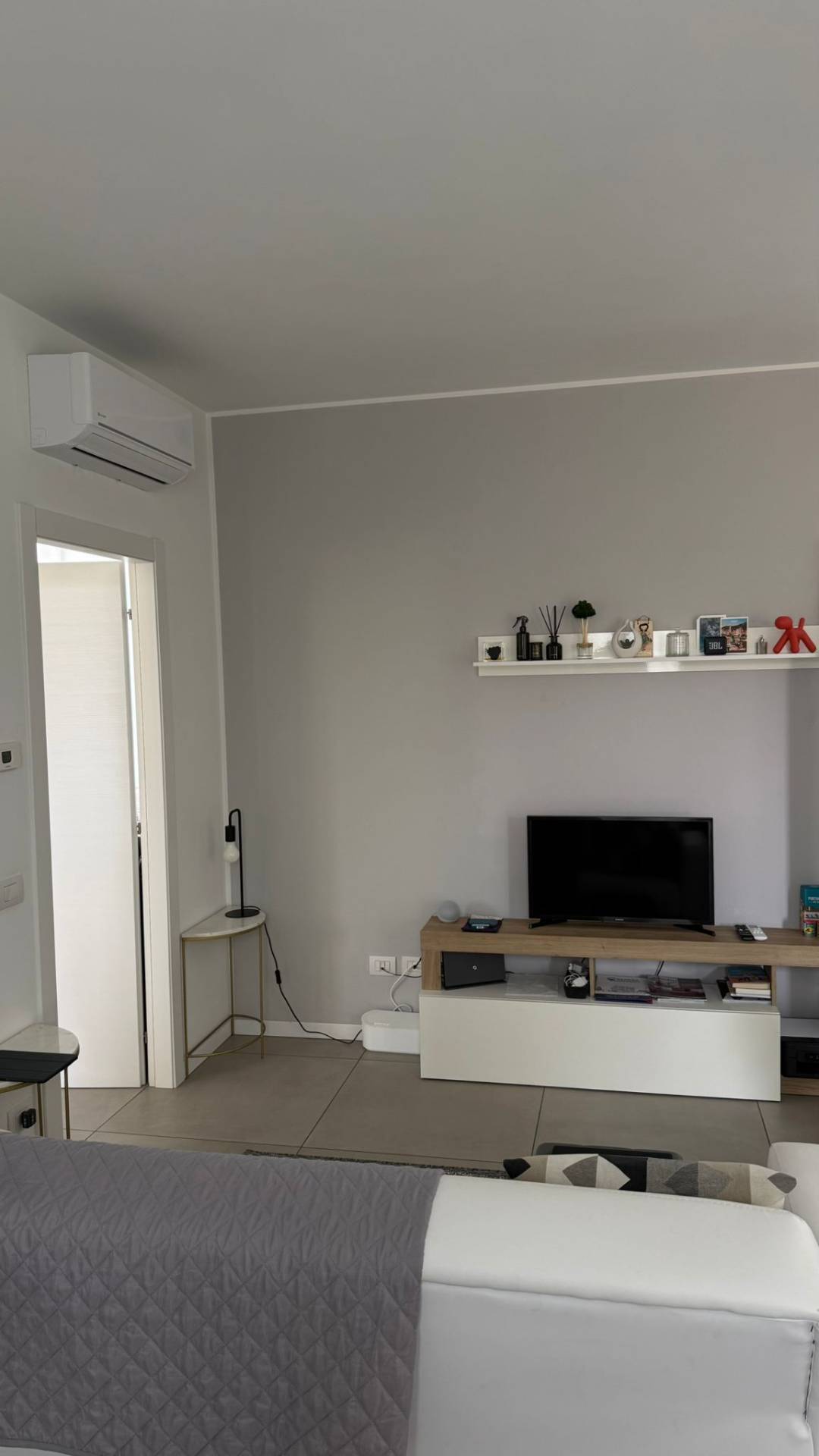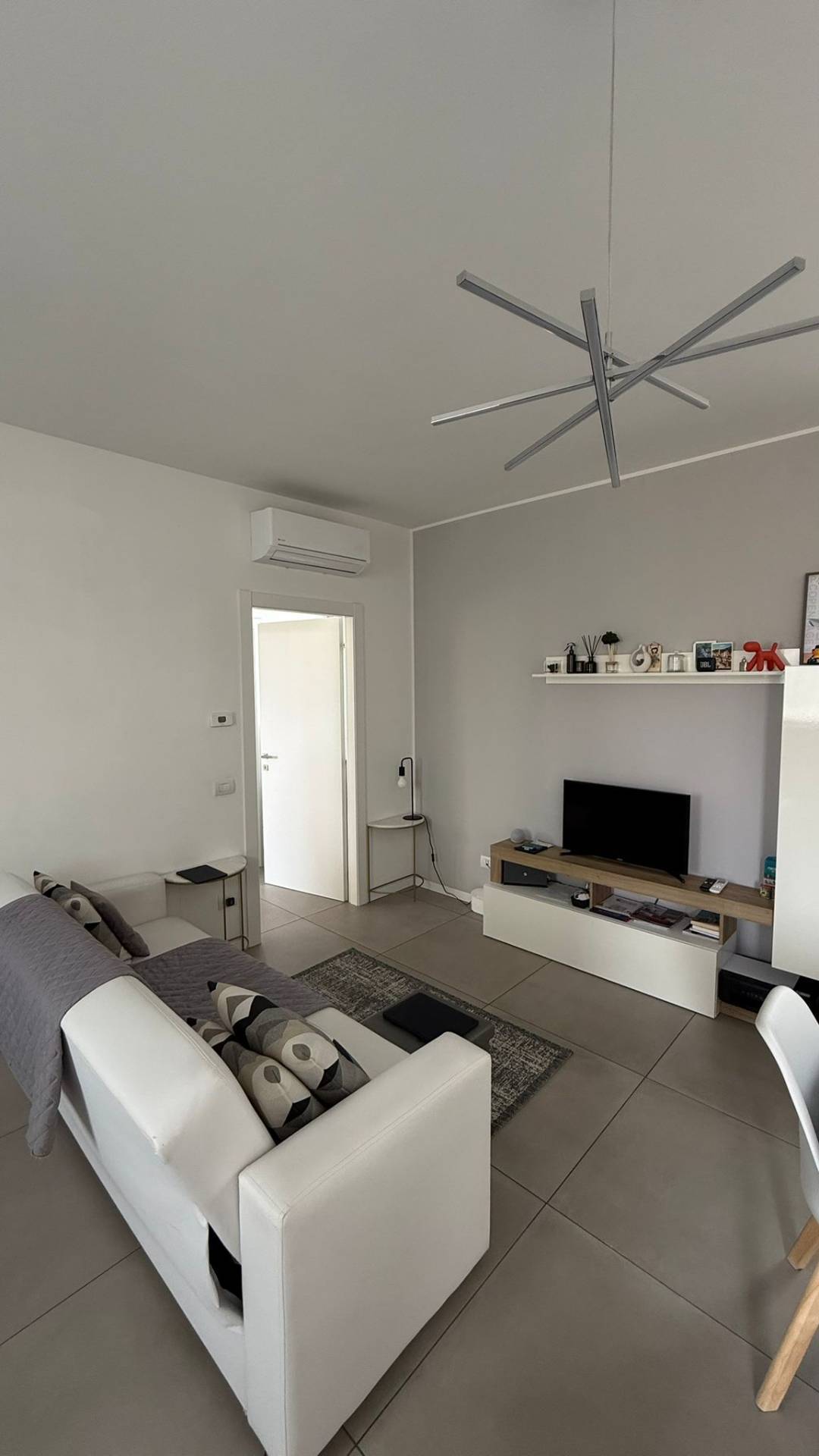L'appartamento, finemente arredato, composto da soggiorno con angolo cottura con fornello a induzione, zona pranzo con divano letto, bagno dotato di sanitari sospesi, box doccia, mobile lavabo e scalda salviette, antibagno per lavatrice e asciugatrice e camera matrimoniale con armadio a tre ante, letto contenitore, due comodini.