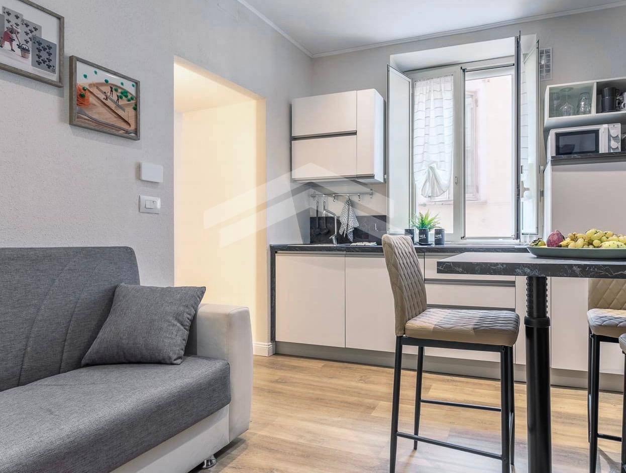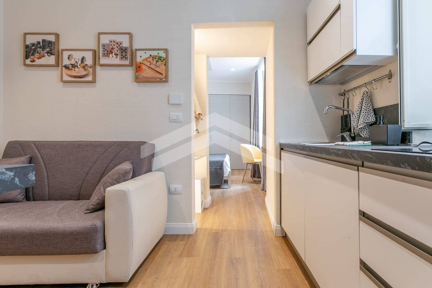 La soluzione composta da un piccolo ingresso, soggiorno con cucina a vista, camera matrimoniale e bagno con doccia.