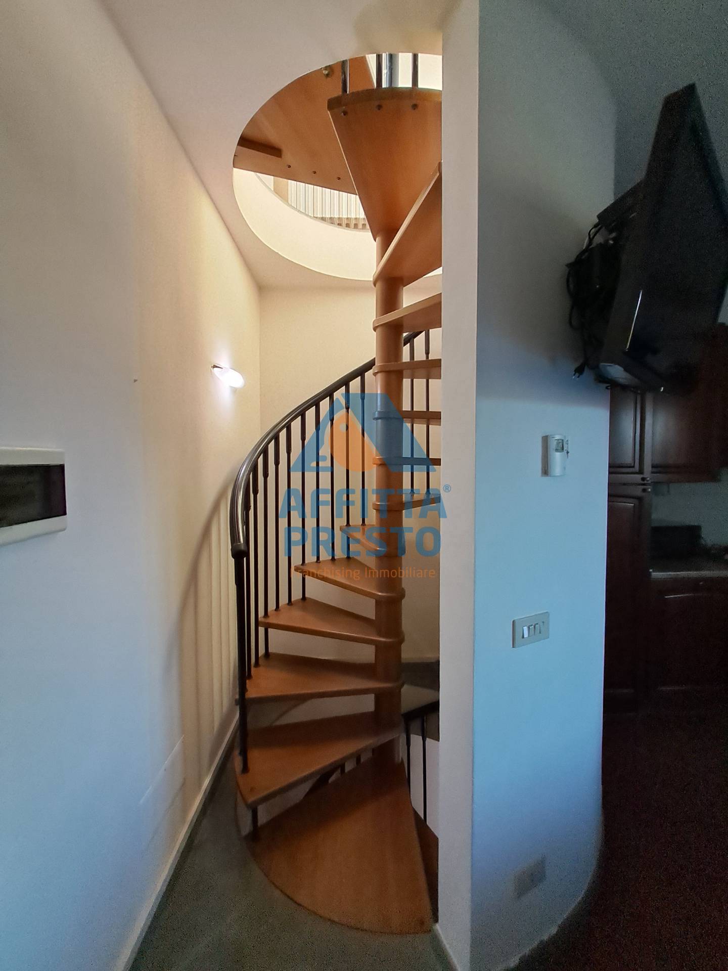 L' appartamento e' composto da cucina soggiorno, disimpegno con scala a chiocciola, bagno con doccia finestrato, con accesso da camera matrimoniale sottotetto.