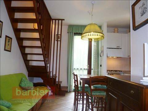Al primo piano troviamo il reparto giorno con angolo cottura affacciato sull'ampio terrazzo angolare abitabile, piccolo disimpegno, reparto notte con letto matrimoniale e bagno con antibagno e box doccia; al piano mansardato ulteriore letto matrimoniale e piccolo bagno di servizio.
