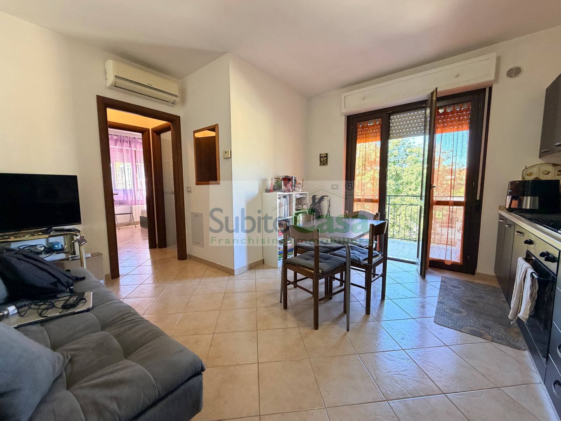 Disponibile dal 1° Gennaio 2026 Il bilocale situato al 2° piano sevito da ascensore, si compone da una zona living con angolo cottura ed uscita sul balcone, disimpegno con armadiatura a parete, 1 camera matrimoniale ed un bagno completo di doccia; L'appartamento dotato di riscaldamento autonomo, aria condizionata, oltre ad usufruire come pertinenza di una cantina, ed un posto auto. L'appartamento ottimo per chi cerca una soluzione situata in un contesto tranquillo e residenziale oltre ad essere vicina a tutti i servizi ed all'universit.