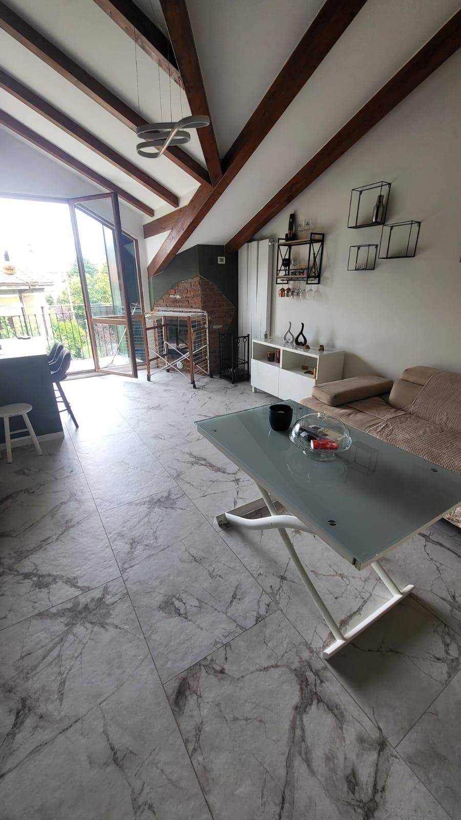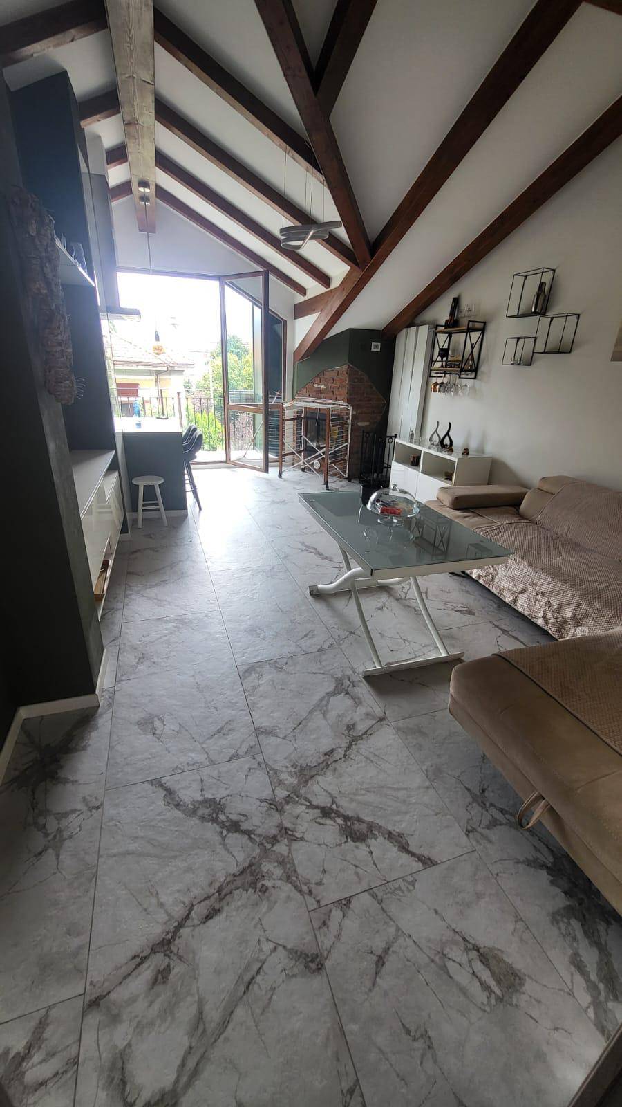 Lappartamento, situato in via Alfieri 12 a Corsico, a pochi passi dal centro, si apre su un raffinato e spazioso soggiorno, impreziosito da un divano angolare, uno splendido caminetto e travi a vista che conferiscono calore e accoglienza allambiente.