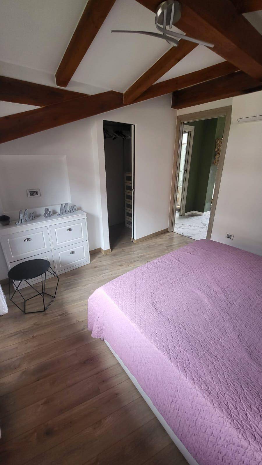 La camera da letto, spaziosa e ben organizzata, ospita un grande letto matrimoniale, una console TV e una splendida cabina armadio aperta, pratica e funzionale.