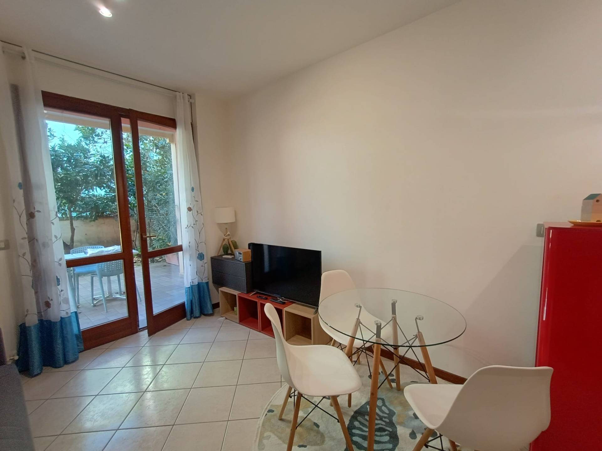 L'immobile composto da ingresso su zona living con cucina a vista, porta finestra sul giardino, piccolo disimpegno, camera matrimoniale e bagno finestrato con box doccia.