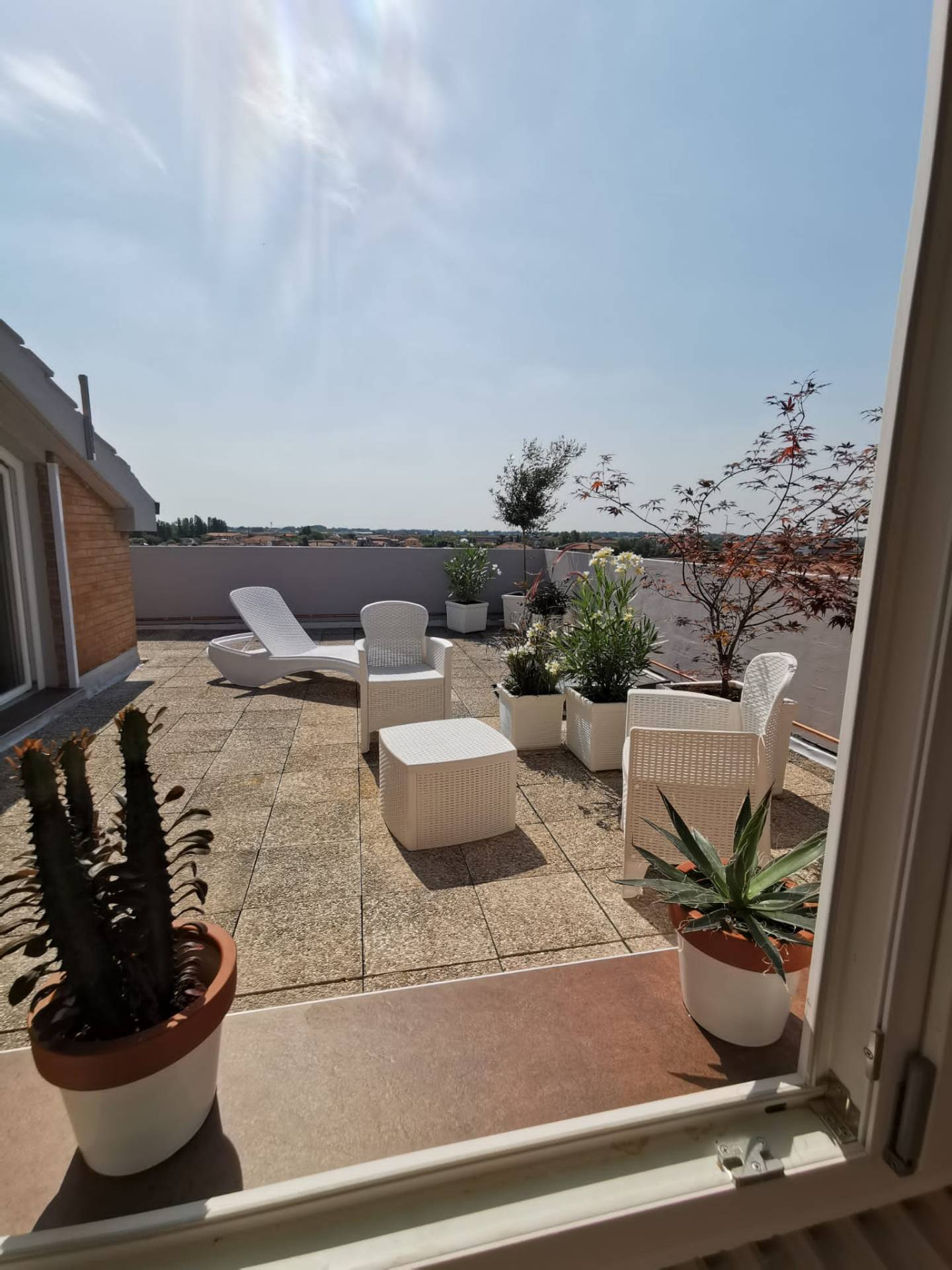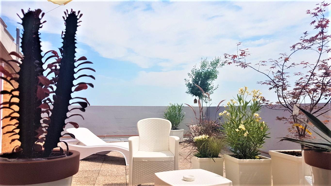 L'ampio terrazzo panoramico, di oltre 60 mq., completamente attrezzato con piante, tavolo, poltrone e sdraio.