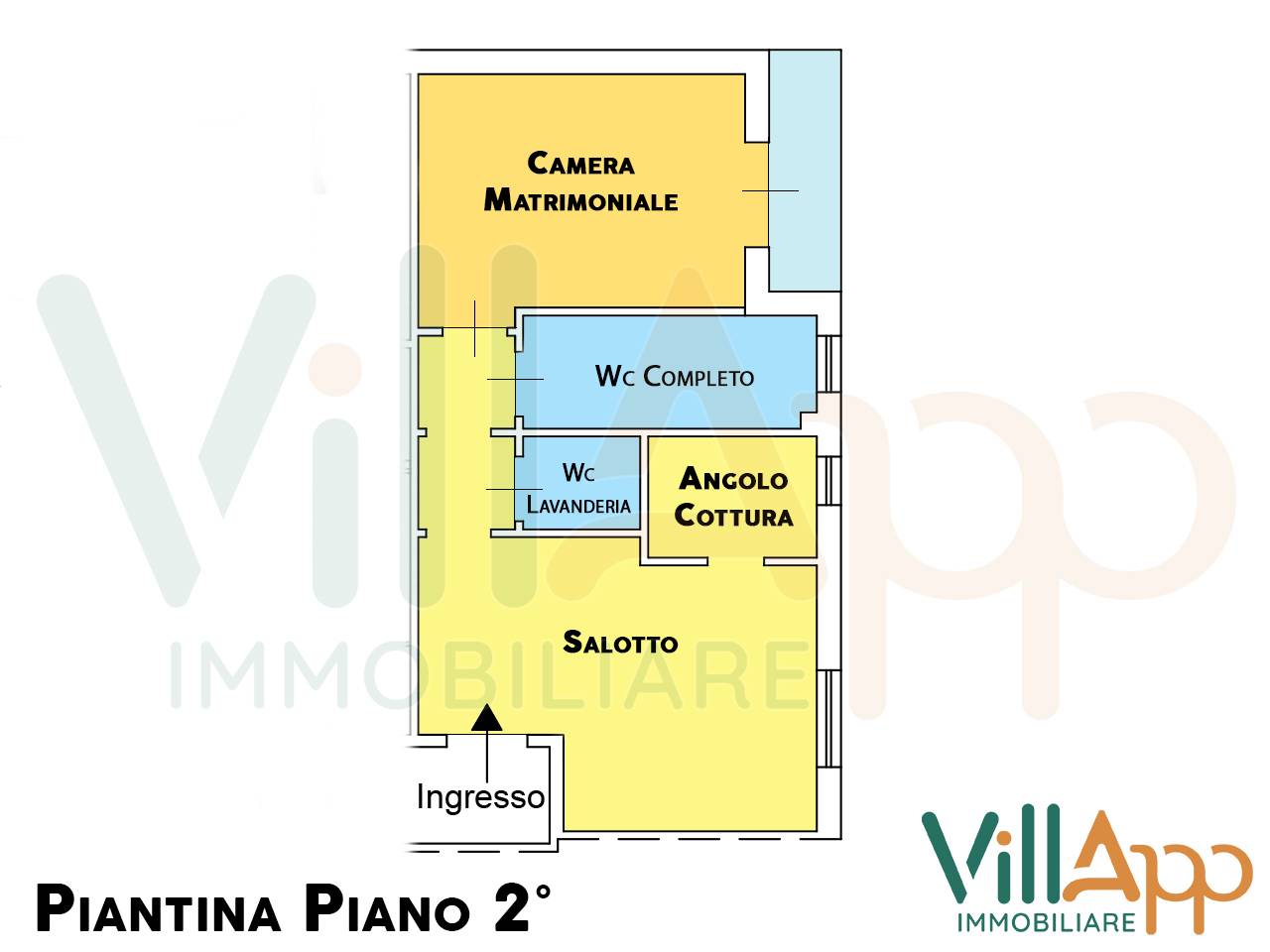 SISTEMAZIONE INTERNI: Piano Secondo: Soggiorno con Angolo Cottura, una Camera matrimoniale, un Bagno con Doccia e un Bagno di servizio ad uso lavanderia.