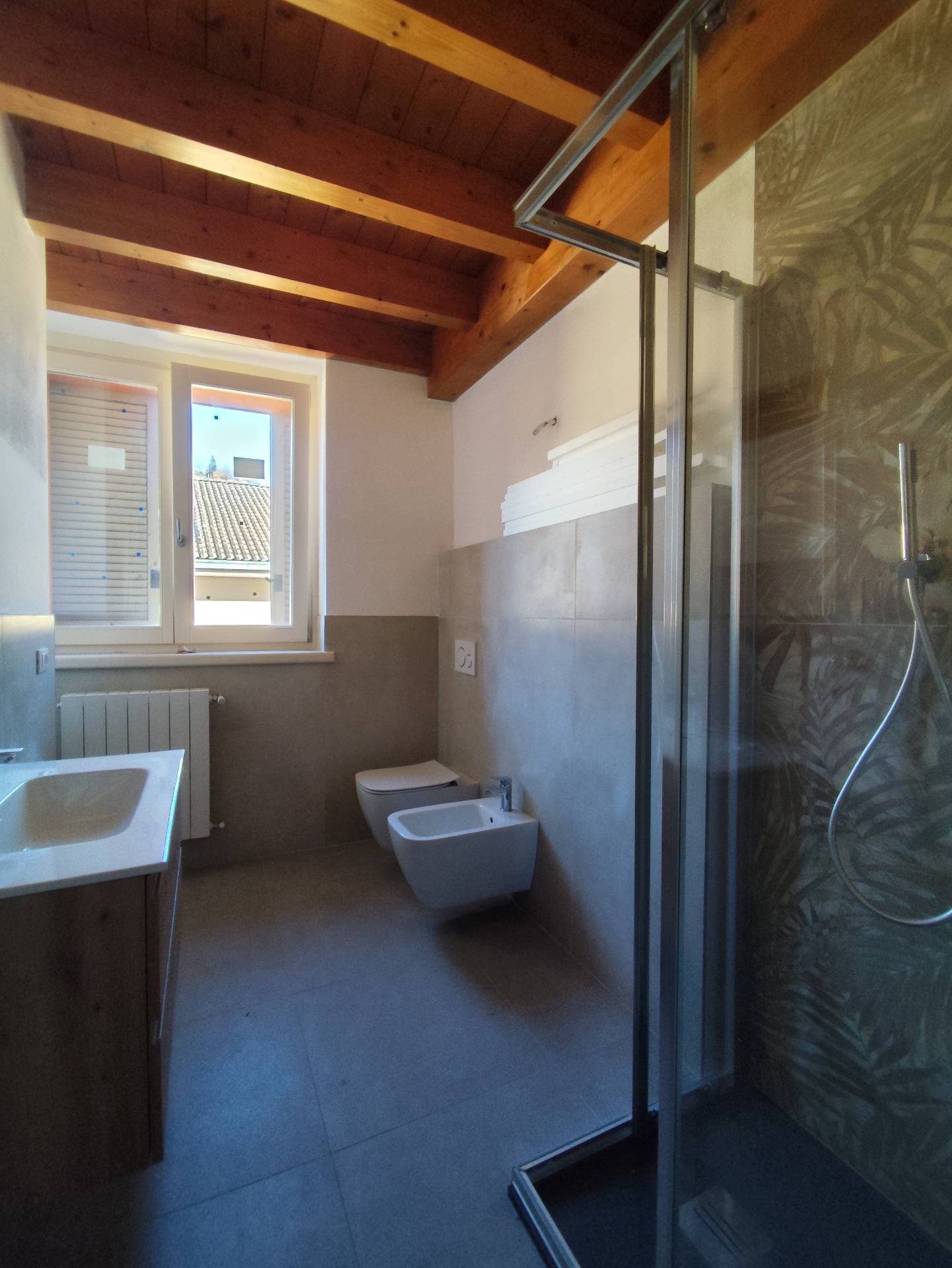 Il piano servito da un bagno funzionale di servizio . In ogni ambiente le travi a vista originali conferiscono un carattere unico, rustico-chic e di grande impatto visivo.