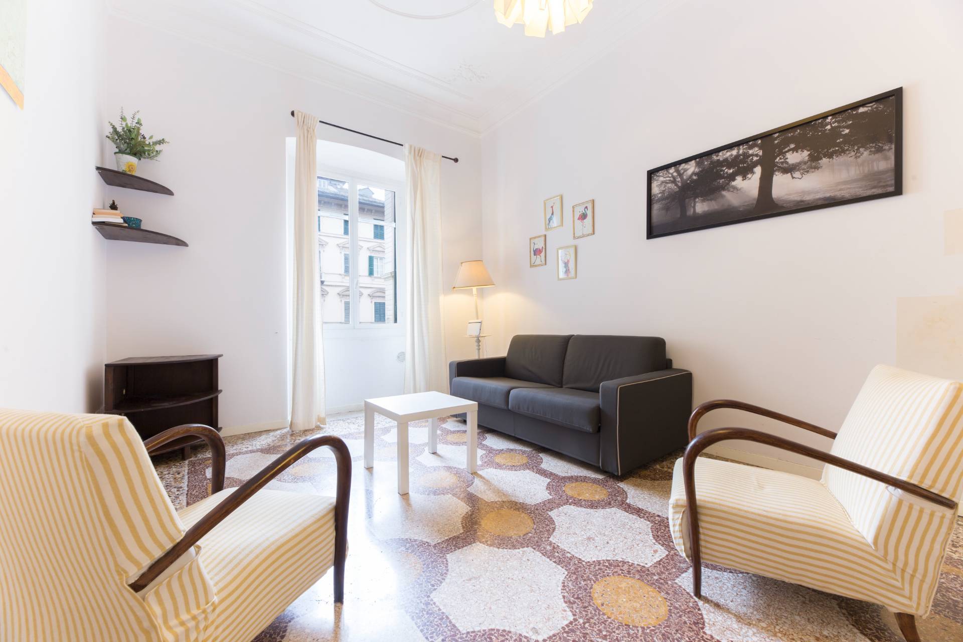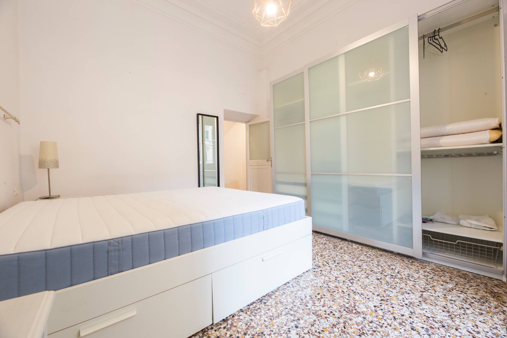 Limmobile si apre su un ingresso soggiorno con affaccio su via Goito e angolo cottura, ed composto da camera matrimoniale, camera singola, cabina armadi ad uso lavanderia e doppi servizi, di cui uno con doccia e uno con vasca.