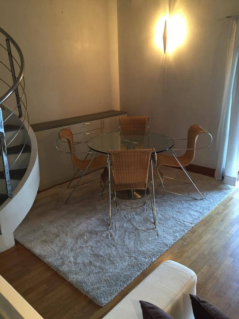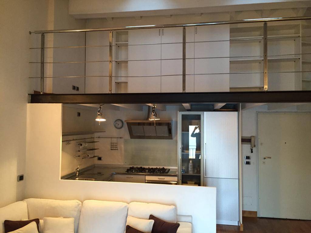 Una scala a chiocciola accompagna ad un soppalco con spazio armadi ideale come studio/ufficio.