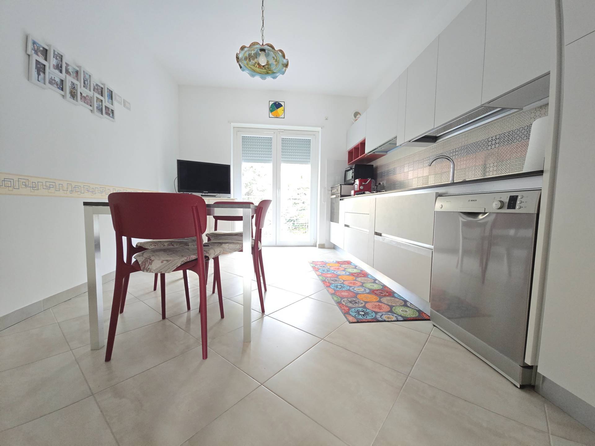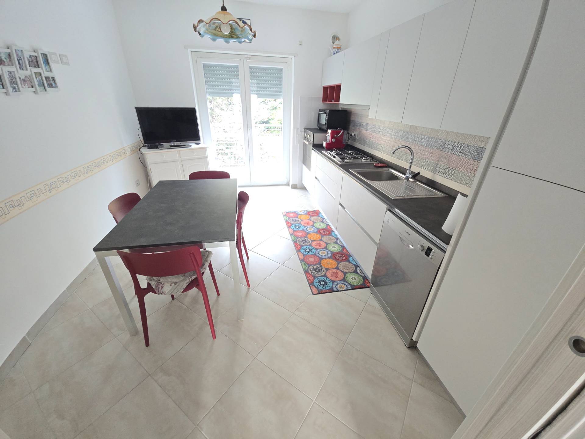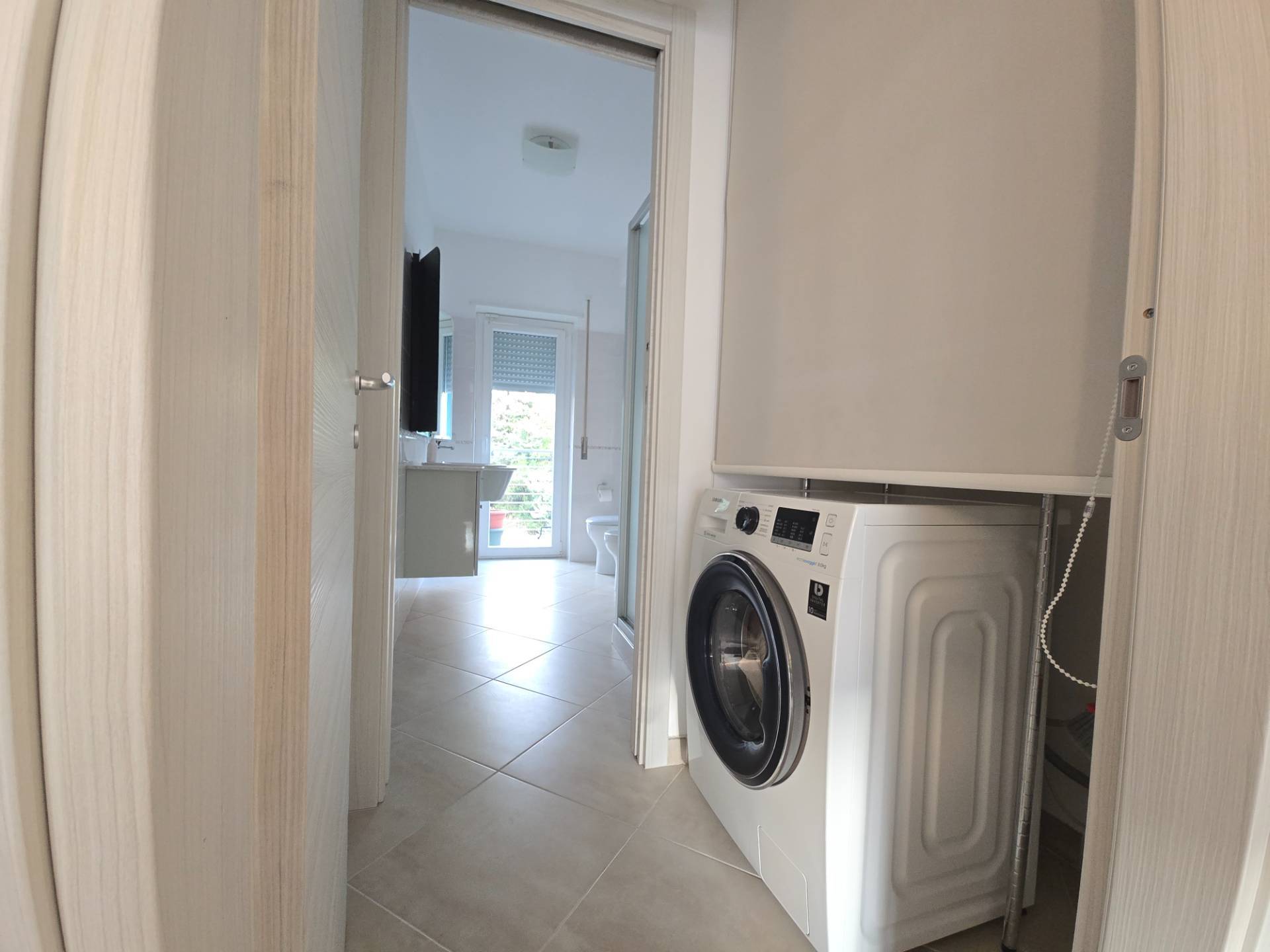La soluzione, molto luminosa, ci accoglie con un salone doppio con ampia vetrata dalla quale si accede ad un comodo balcone, la cucina, anch'essa servita da balcone, separata dal salone da una porta e si distingue per l'importante metratura.