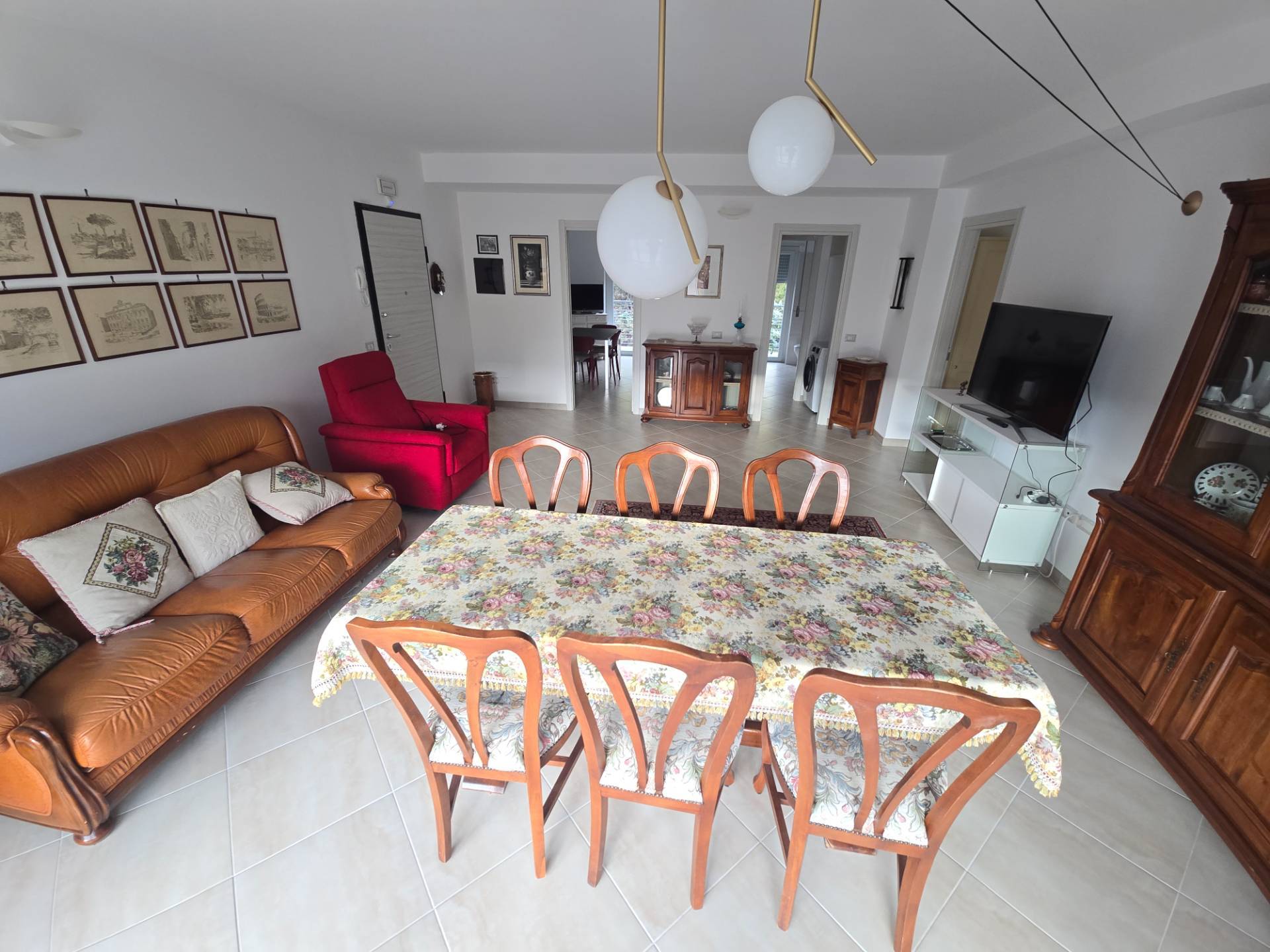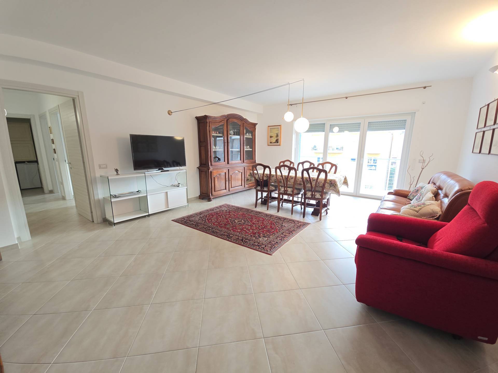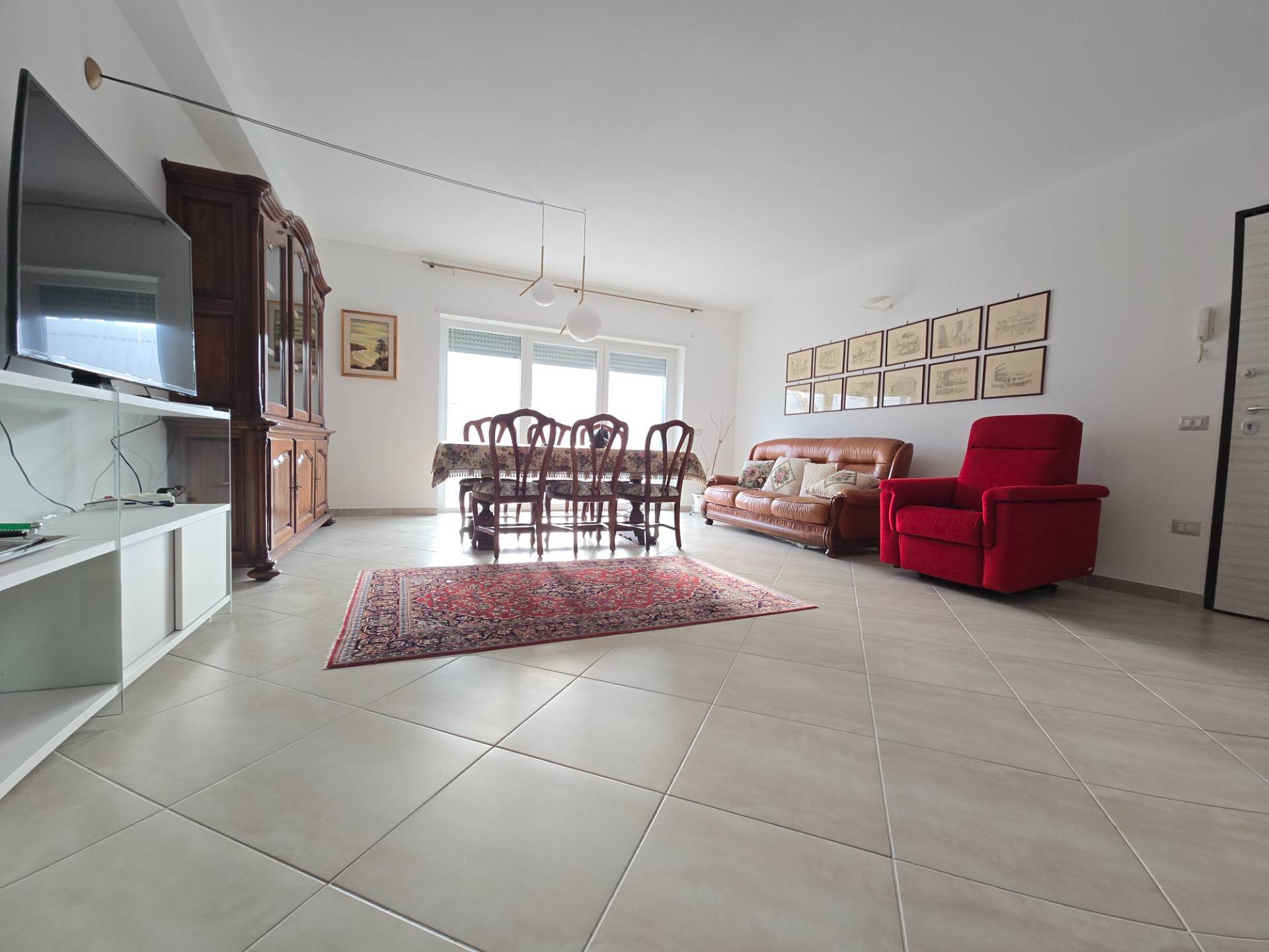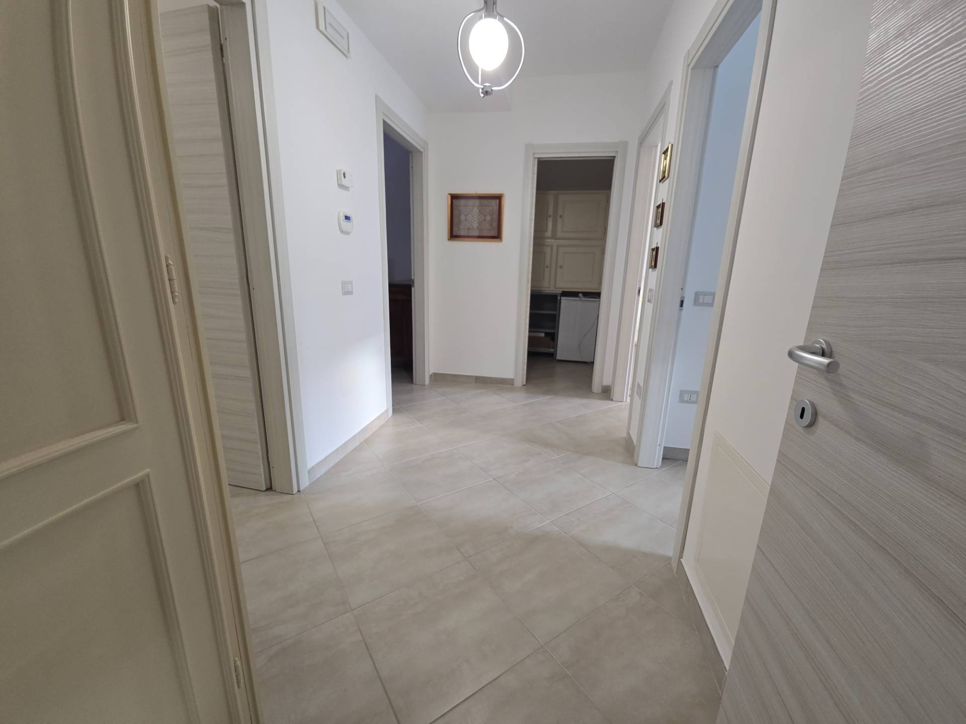 La soluzione, molto luminosa, ci accoglie con un salone doppio con ampia vetrata dalla quale si accede ad un comodo balcone, la cucina, anch'essa servita da balcone, separata dal salone da una porta e si distingue per l'importante metratura.