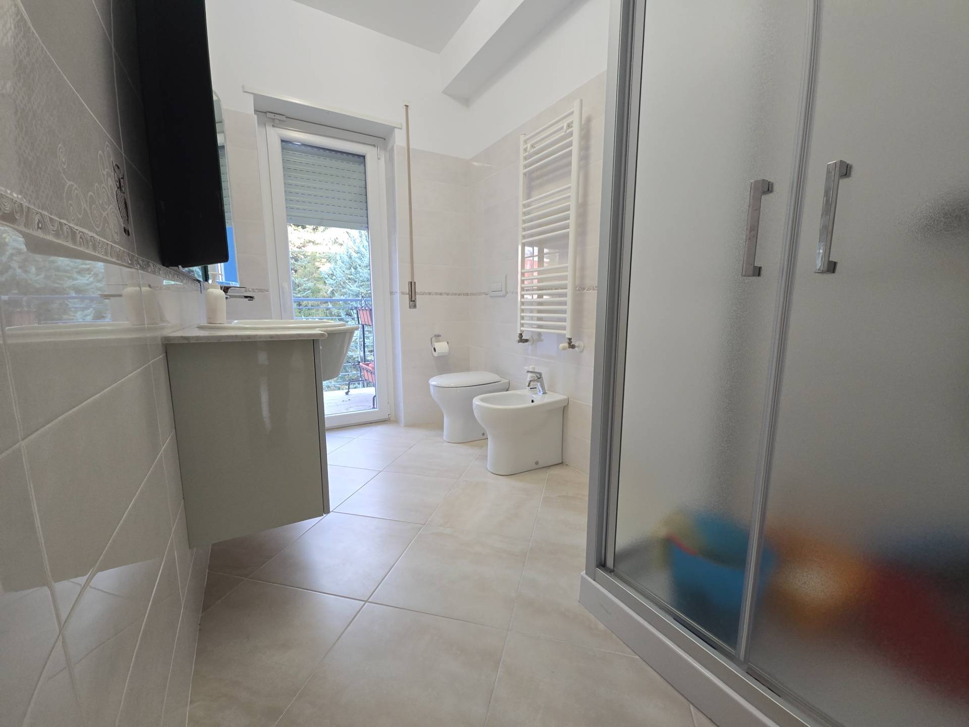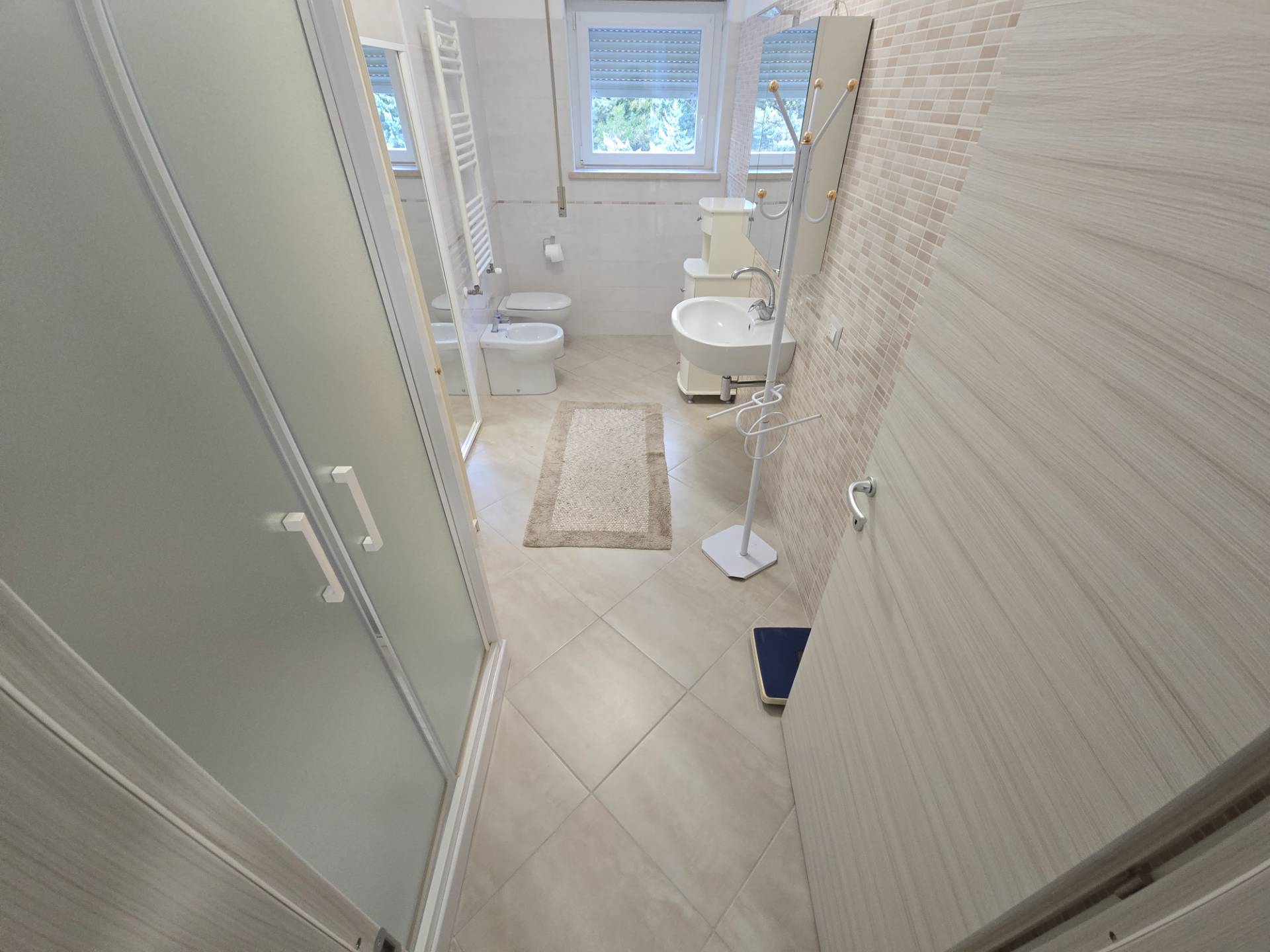 Tutta la zona giorno servita da un comodo bagno con doccia e antibagno.