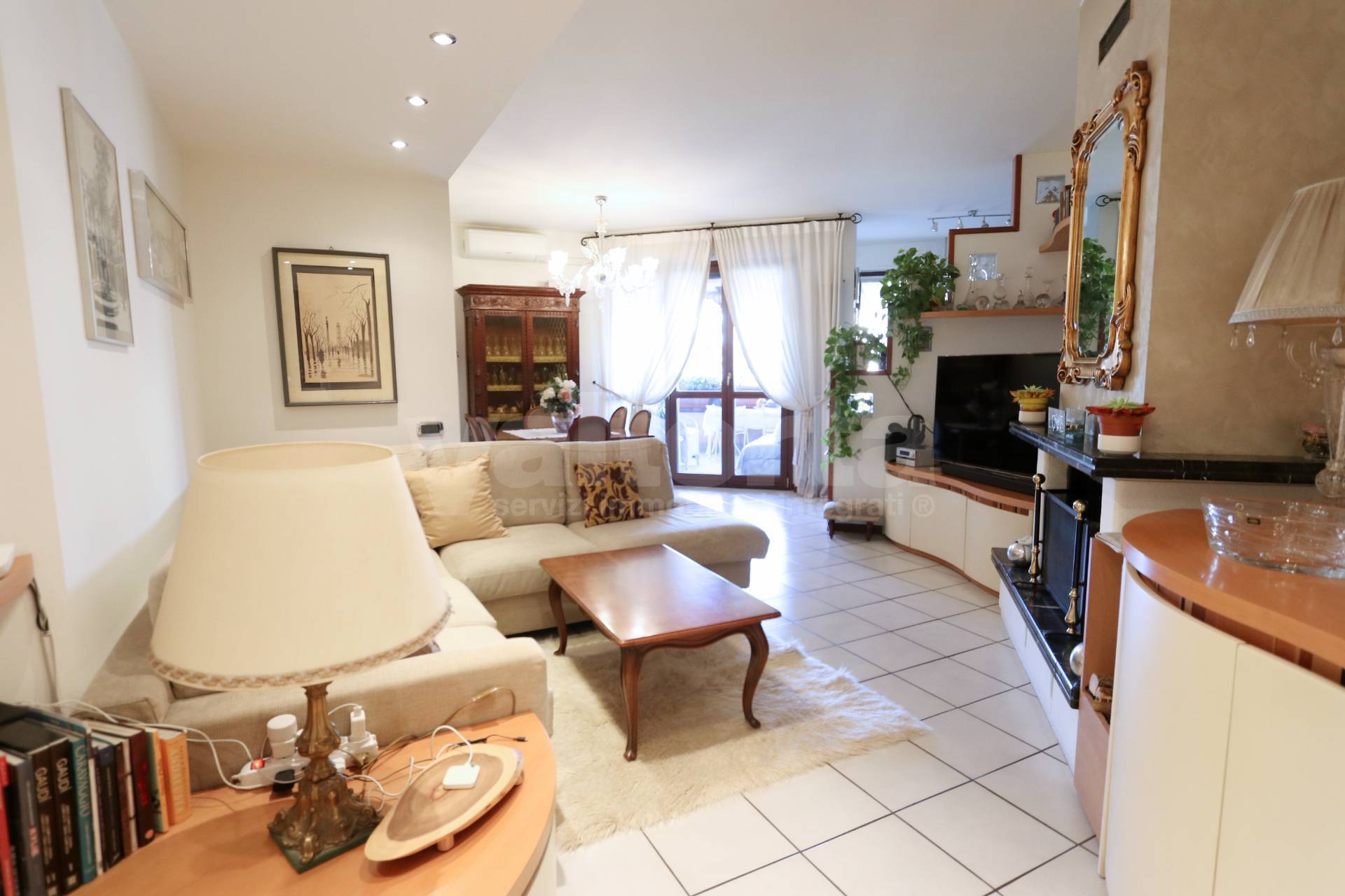 Limmobile si distingue per una distribuzione funzionale degli spazi: accogliente soggiorno con camino, cucina a vista separata, entrambi con accesso diretto al terrazzo, ideale per momenti di relax allaperto.