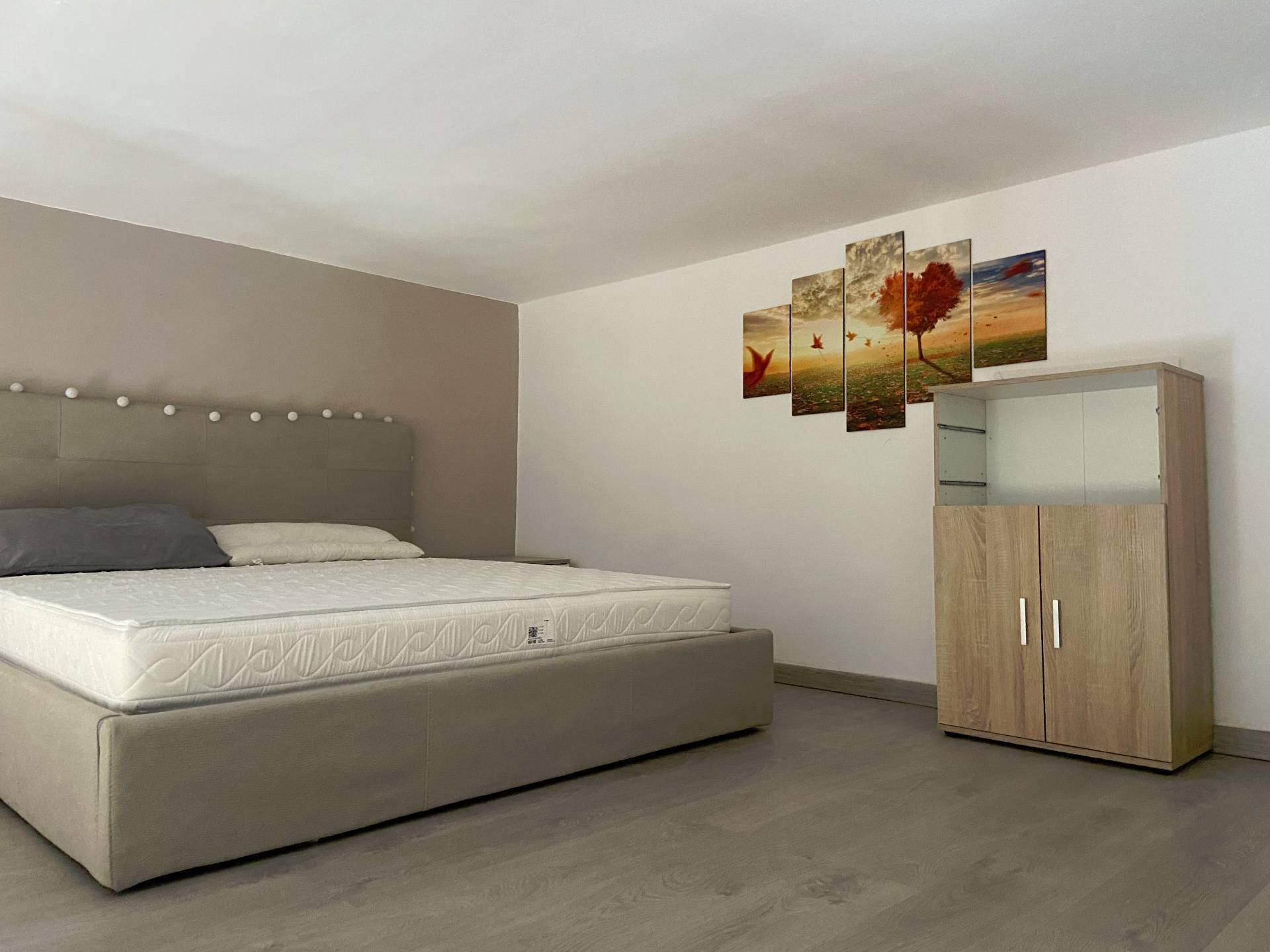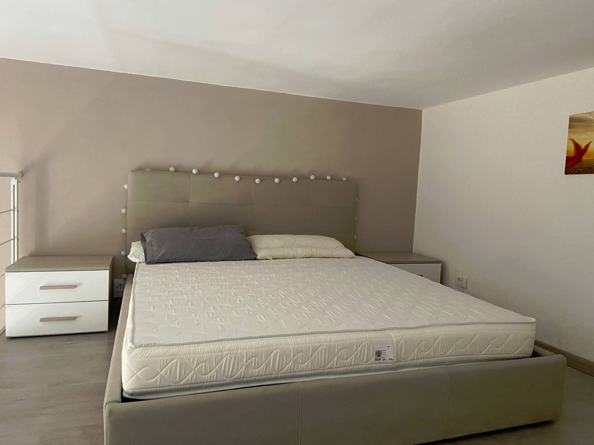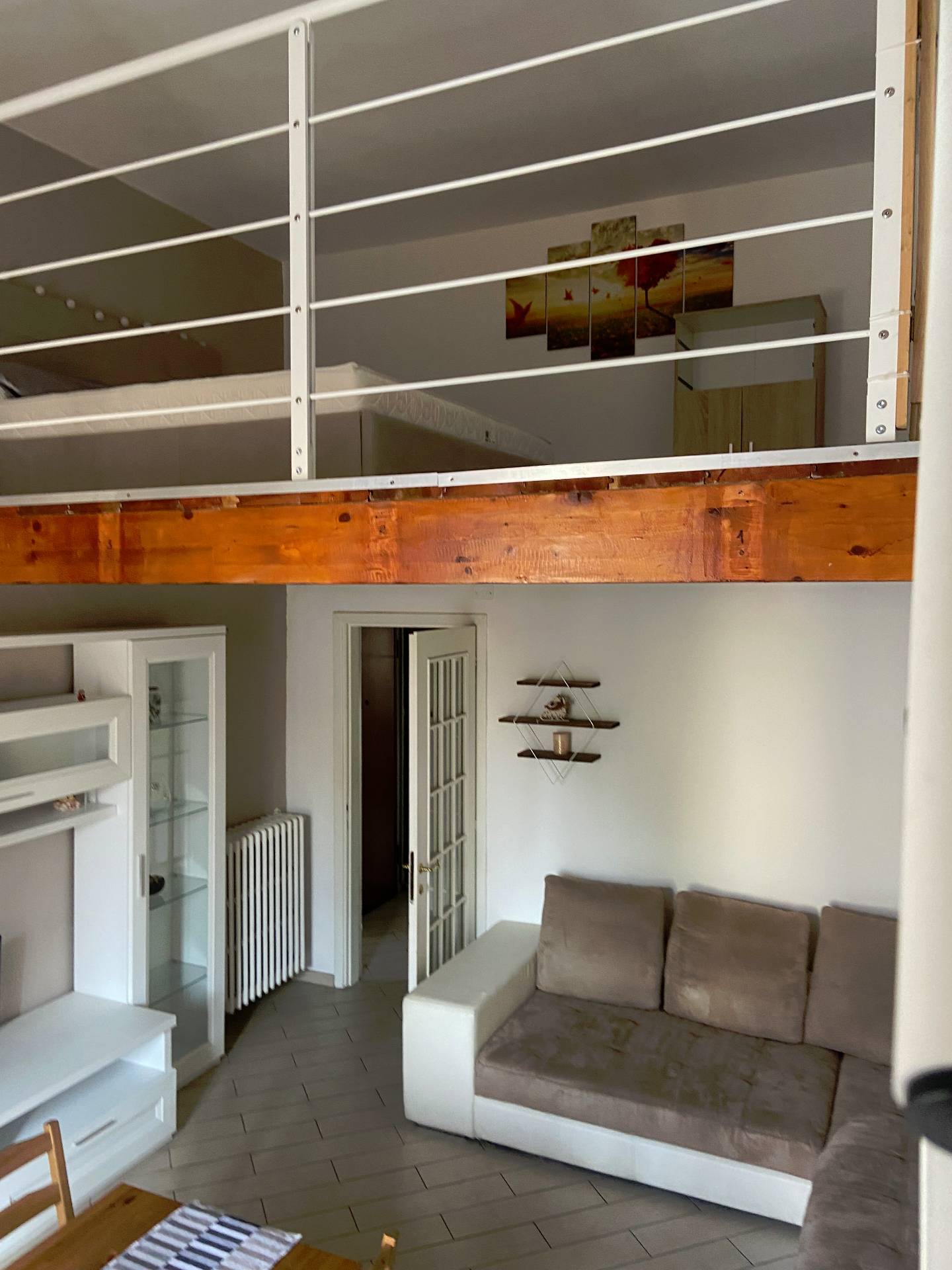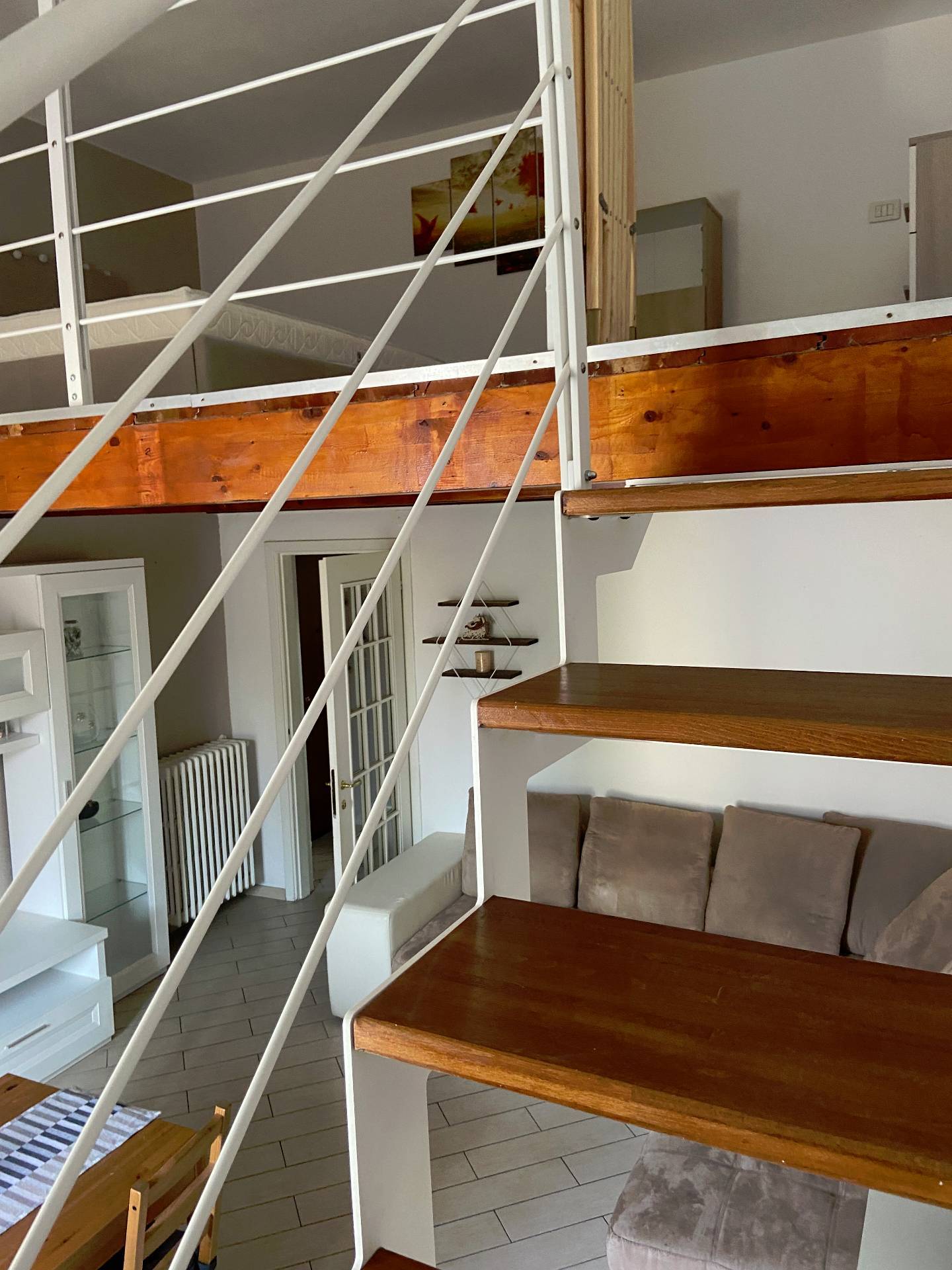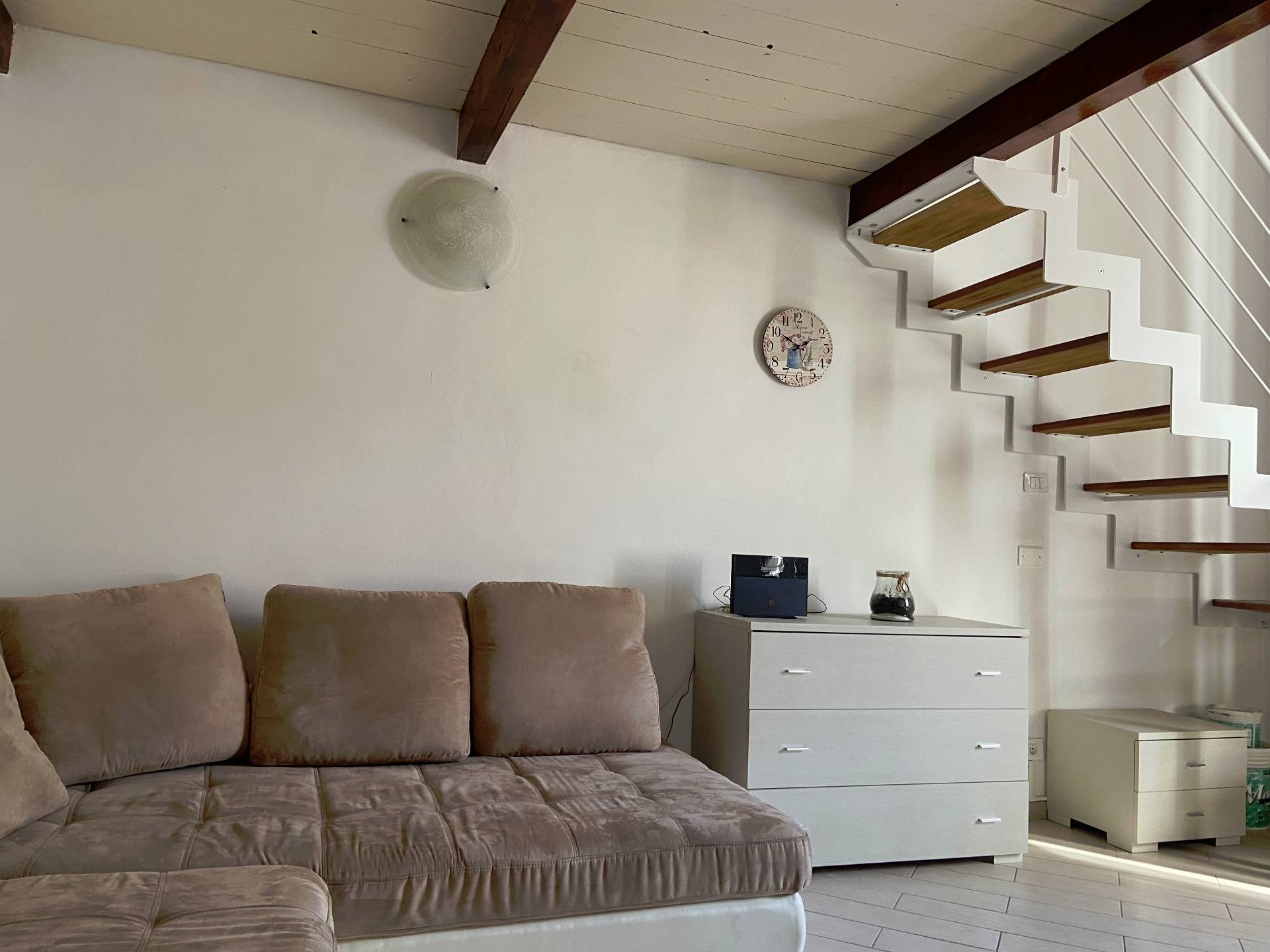 Ingresso con ampio armadio a due ante, ampio soggiorno con zona tv e divano letto, accesso alla camera matrimoniale in soppalco, cucina abitabile e bagno con doccia e finestra.