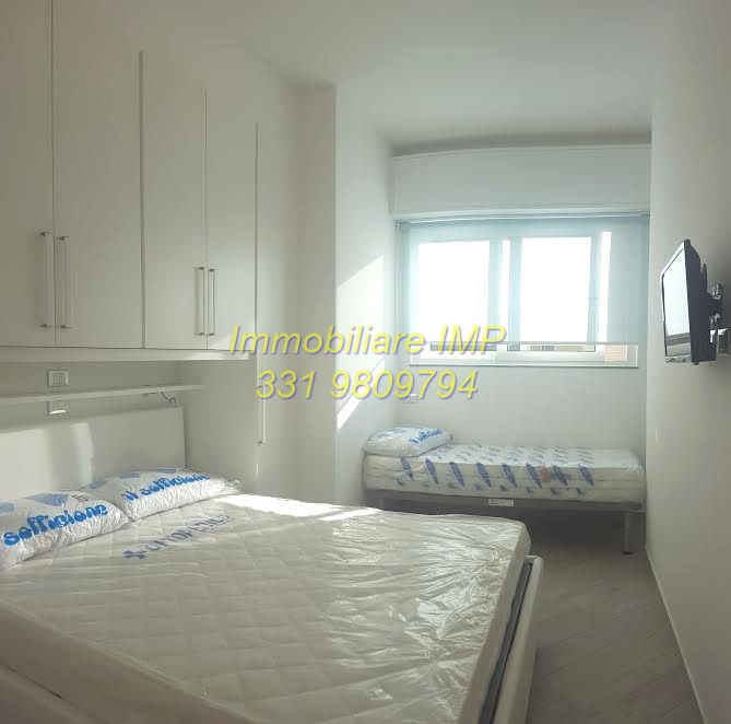 E' dotato di doppi vetri, con serramenti scorrevoli! Tapparelle tutte elettriche con comando singolo e centralizzato! Aria Condizionata! Doppi Servizi (uno dotato di finestra, l'altro con aspirazione forzata)! Tipologia: trilocale ampio con doppi servizi (una zona giorno, due camere da letto, due bagni). Composizione dell'immobile internamente: comodo ingresso, ampio ripostiglio dotato di appendiabiti, cameretta con tre posti letto (di cui uno singolo ed un matrimoniale), due bagni entrambi con doccia grande, camera da letto padronale con lettone matrimoniale due posti letto classico + un letto abbattibile (che chiuso un divano od un eventuale posto letto singolo ed aperto un altro ampio letto matrimoniale due posti per adulti), soggiorno con angolo cottura (con un altro divano letto matrimoniale apribile all'occorrenza), ampio e vivibile balcone angolare con esposizione sud/ovest con tavolo e sedie in esterno! L'immobile ha in dotazione: tapparelle elettriche in tutto l'alloggio attivabili singolarmente con un comando prossimo ad ogni tapparella, ma anche attraverso un comando centralizzato posizionato nell'ingresso.