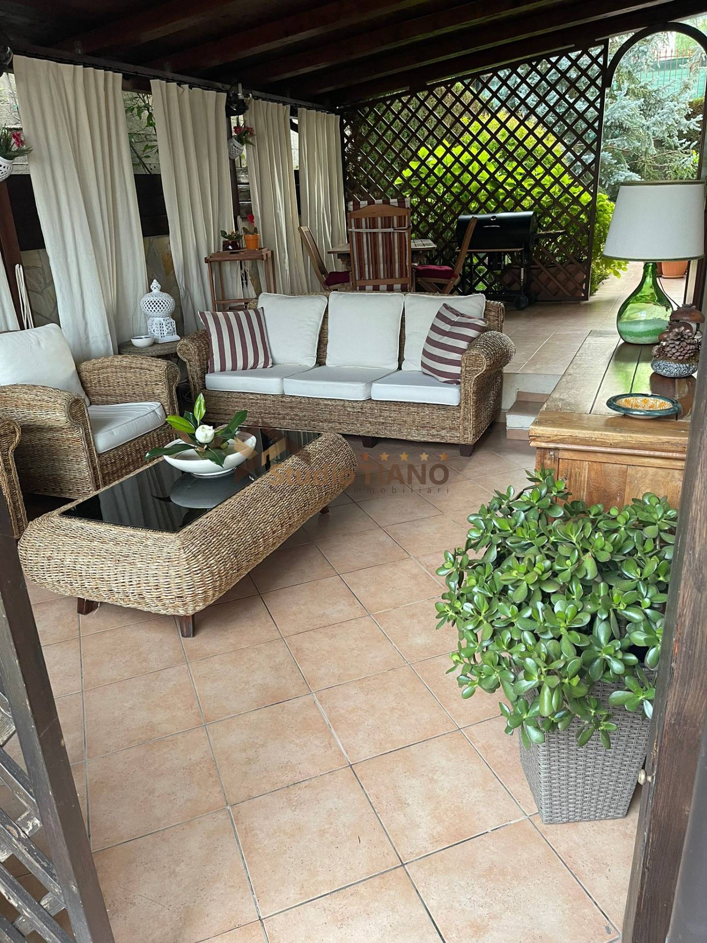 Gli spazi esterni rappresentano un autentico valore aggiunto: terrazzo panoramico coperto e portico in legno lamellare arredato, completo di area relax con divani in vimini, illuminazione datmosfera e zona barbecue, ideale per momenti conviviali allaperto.