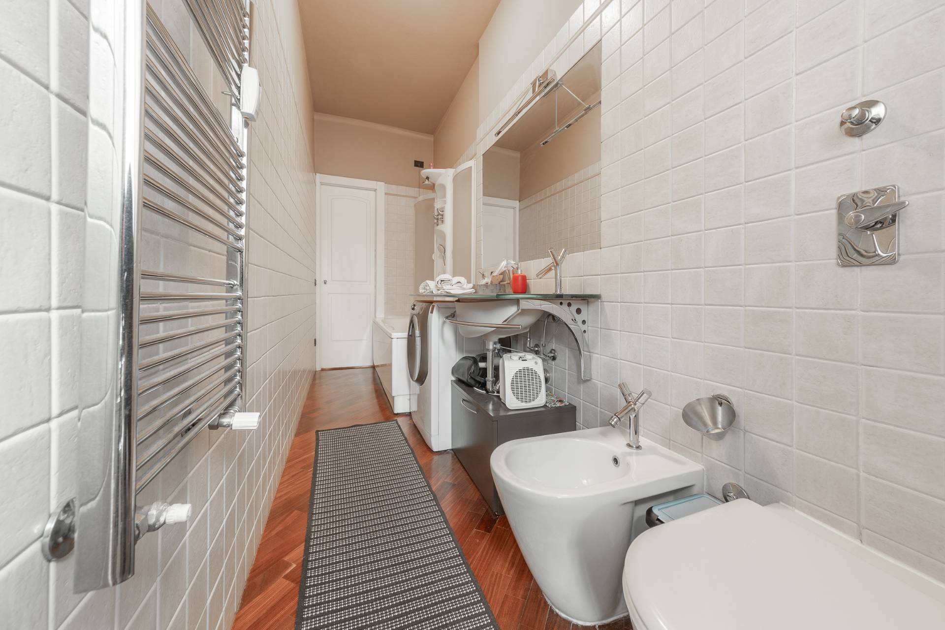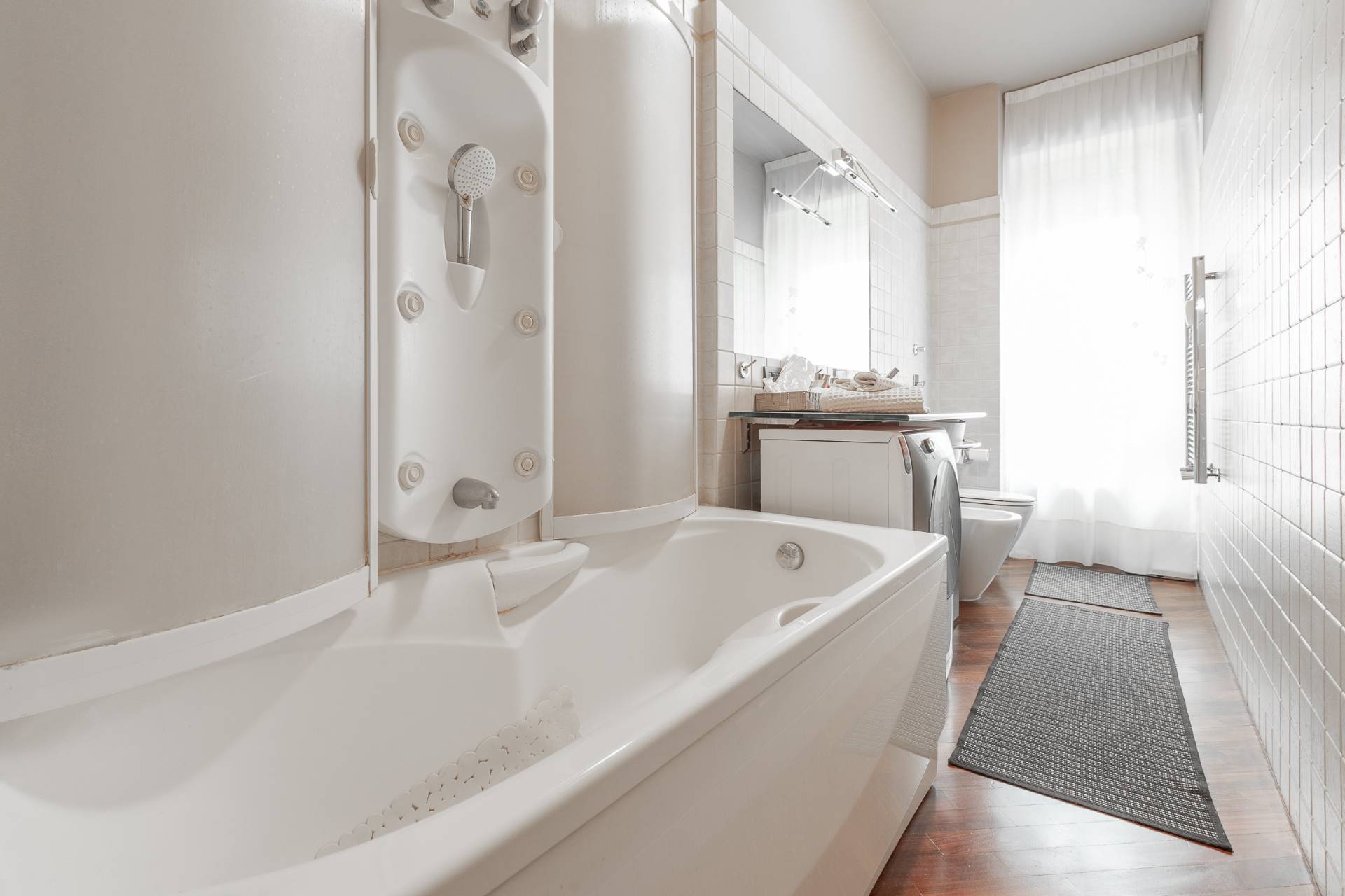 Il bagno, ampio e funzionale, ha una vasca con doccia idromassaggio e lavatrice.